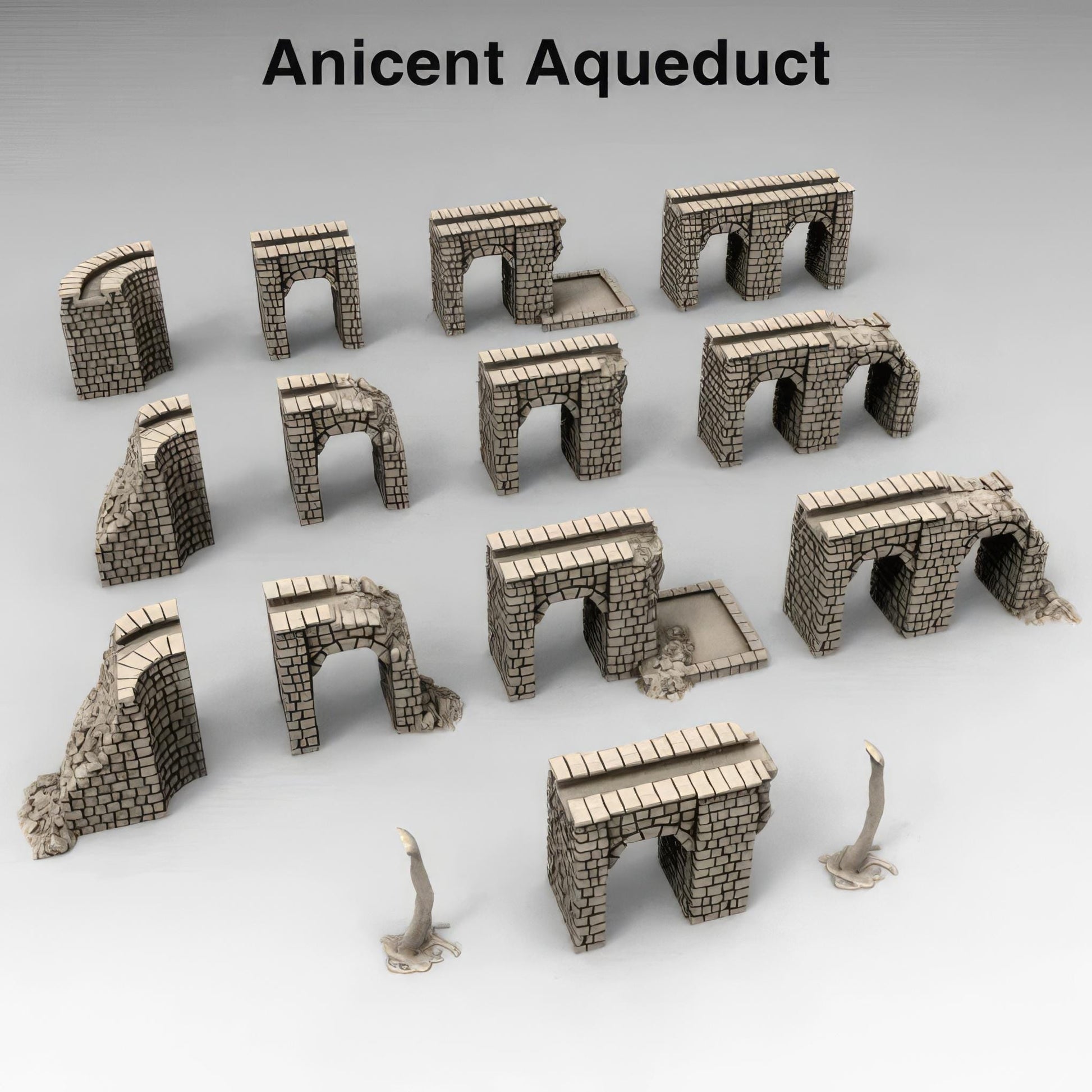 The Ancient Aqueduct is a 13-piece versatile modular terrain set designed for fantasy or sci-fi tabletop and role-playing games. This set includes aqueduct sections, a fountain pool, and cascading waterfalls, allowing you to craft an expansive aqueduct structure. Featuring curved and ruined sections, it brings a sense of age and mystery to jungle or urban battlefields. The aqueduct not only enhances the aesthetic but also provides strategic blocking and cover for miniatures during skirmish games.