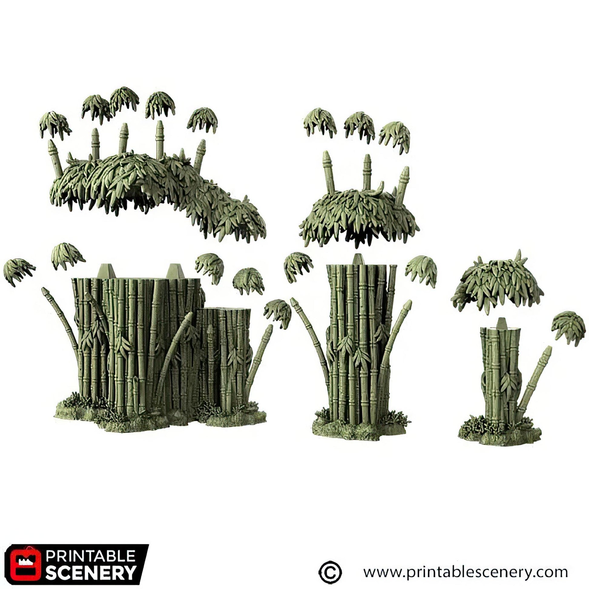 The Wilderness Scatter set includes three unique bamboo models, each featuring lush, leafy tops that bring natural beauty to your tabletop. Some assembly and gluing are required, making them perfect for enhancing wilderness or jungle-themed settings in RPGs and wargames.