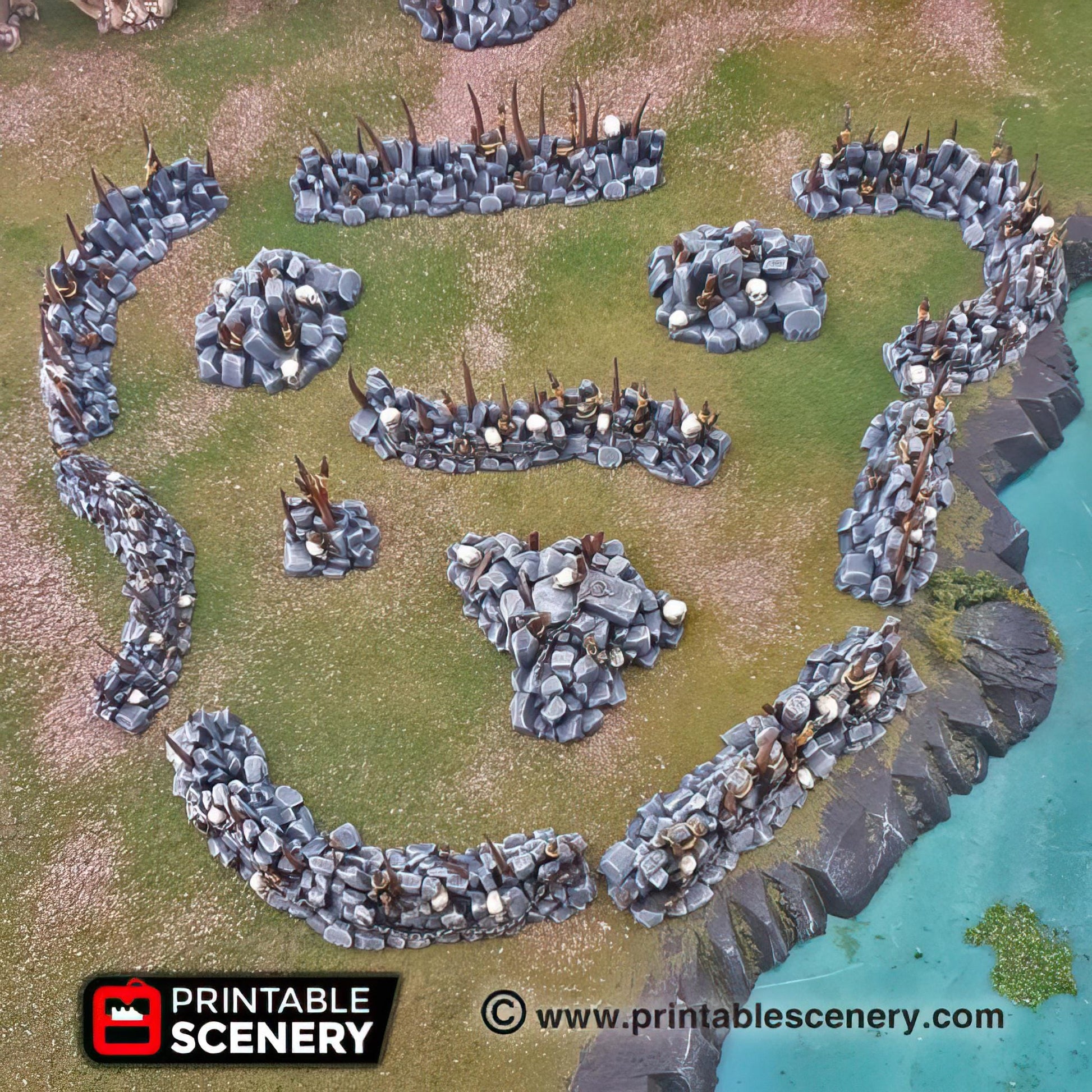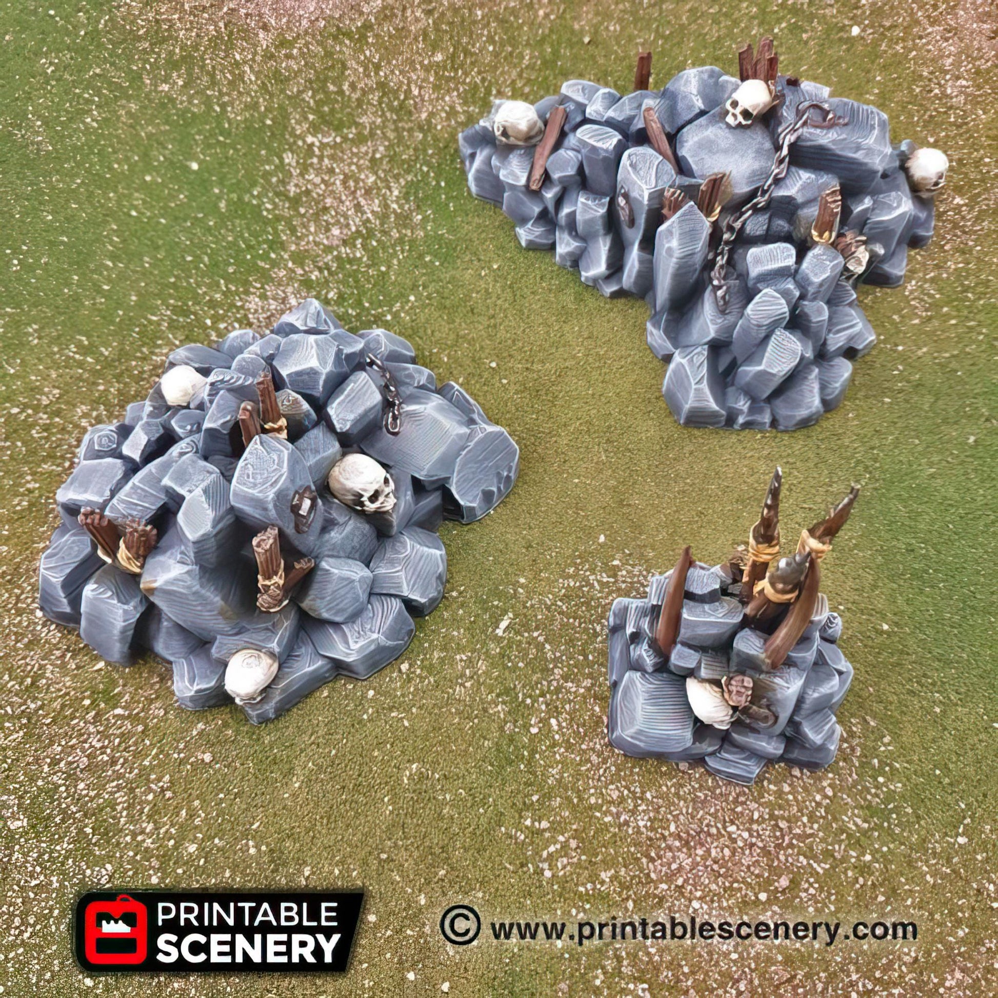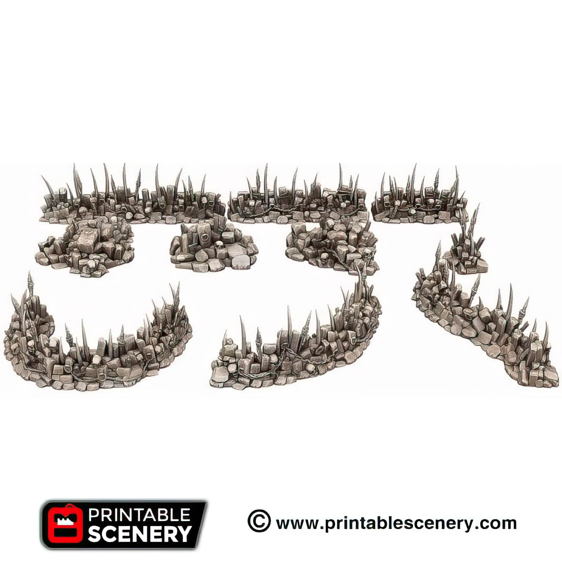 The Barricades and Rubble Set includes ten unique scatter terrain pieces, featuring barricades and debris piles adorned with stones, spears, skulls, and chains. Perfect for offering cover or serving as objectives, these versatile pieces add depth and tactical variety to tabletop skirmish and role-playing games.