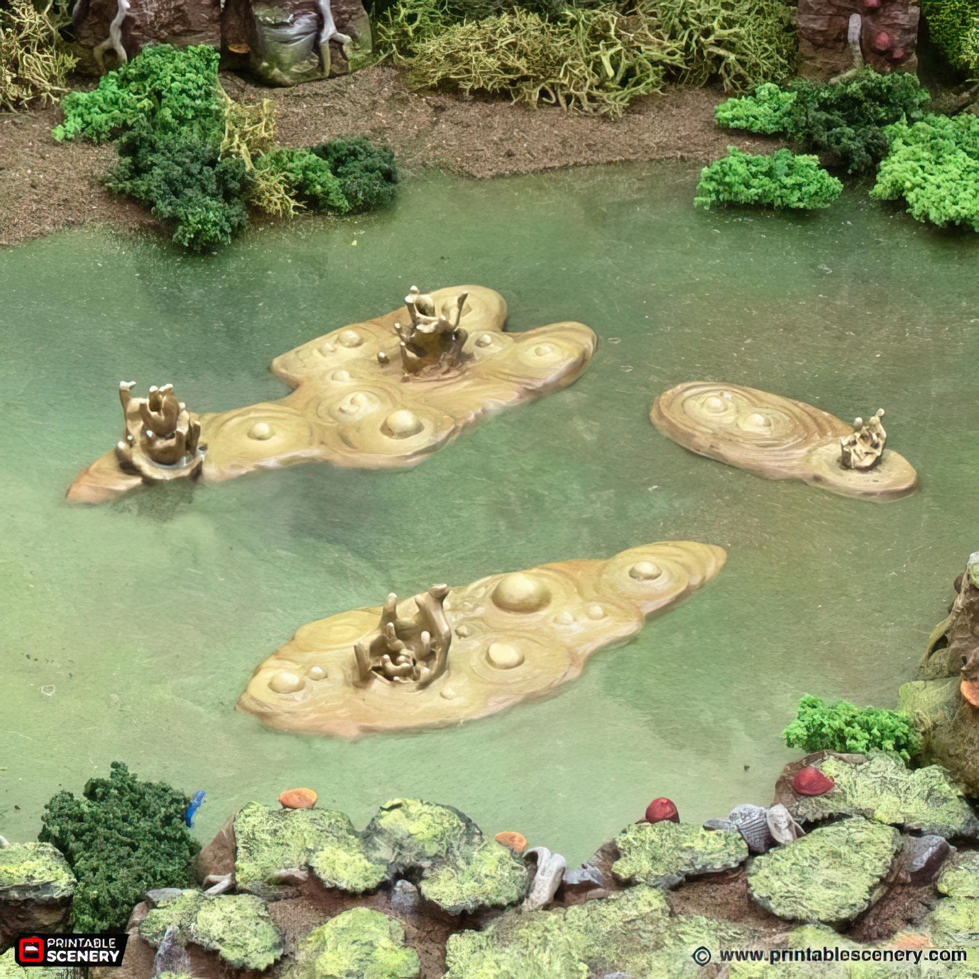 Bring the foul atmosphere of the Bog of Ever Stench to your tabletop with this 6-piece swamp scatter set. Each piece captures the murky, bubbling filth of the infamous bog, perfect for creating treacherous marshlands or cursed wetlands in your RPGs or wargames. As a bonus, the set includes 3 individual mud pieces that can be placed on water terrain to enhance the depth and danger of your scene. Elevate your game with the grimy, unsettling detail of the Bog of Ever Stench.
