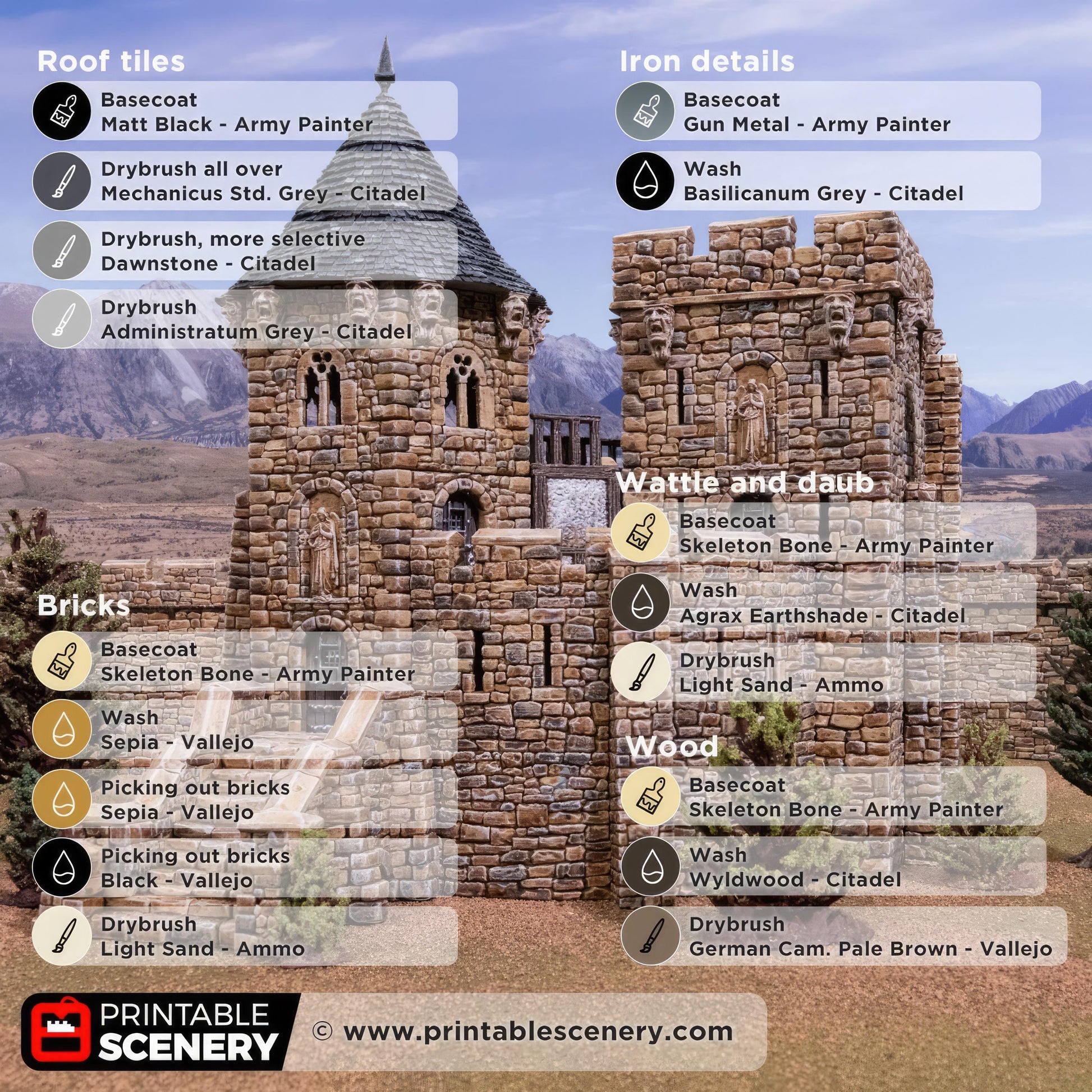 The Queen’s Quarters is a grand building that combines the Square Bastion from the Barracks with a HEX Tower to create an impressive and versatile structure. The central building spans four levels, offering ample space for storytelling and gameplay. Included are fireplace buttresses, corbels, a conical roof tile, doors, and large steps leading up to a working door. Fully compatible with all HEX and square buildings, the Queen’s Quarters makes a commanding addition to any castle layout.