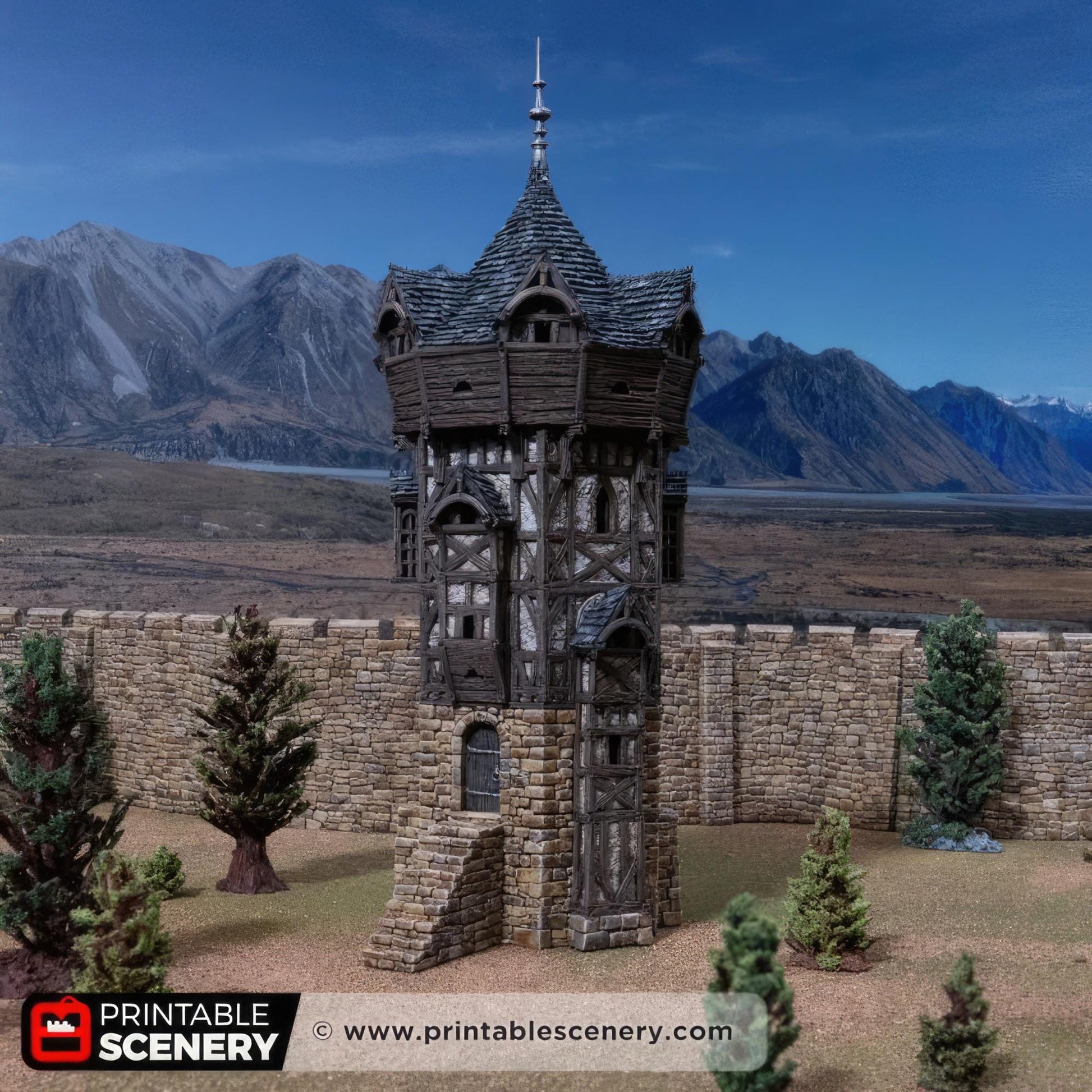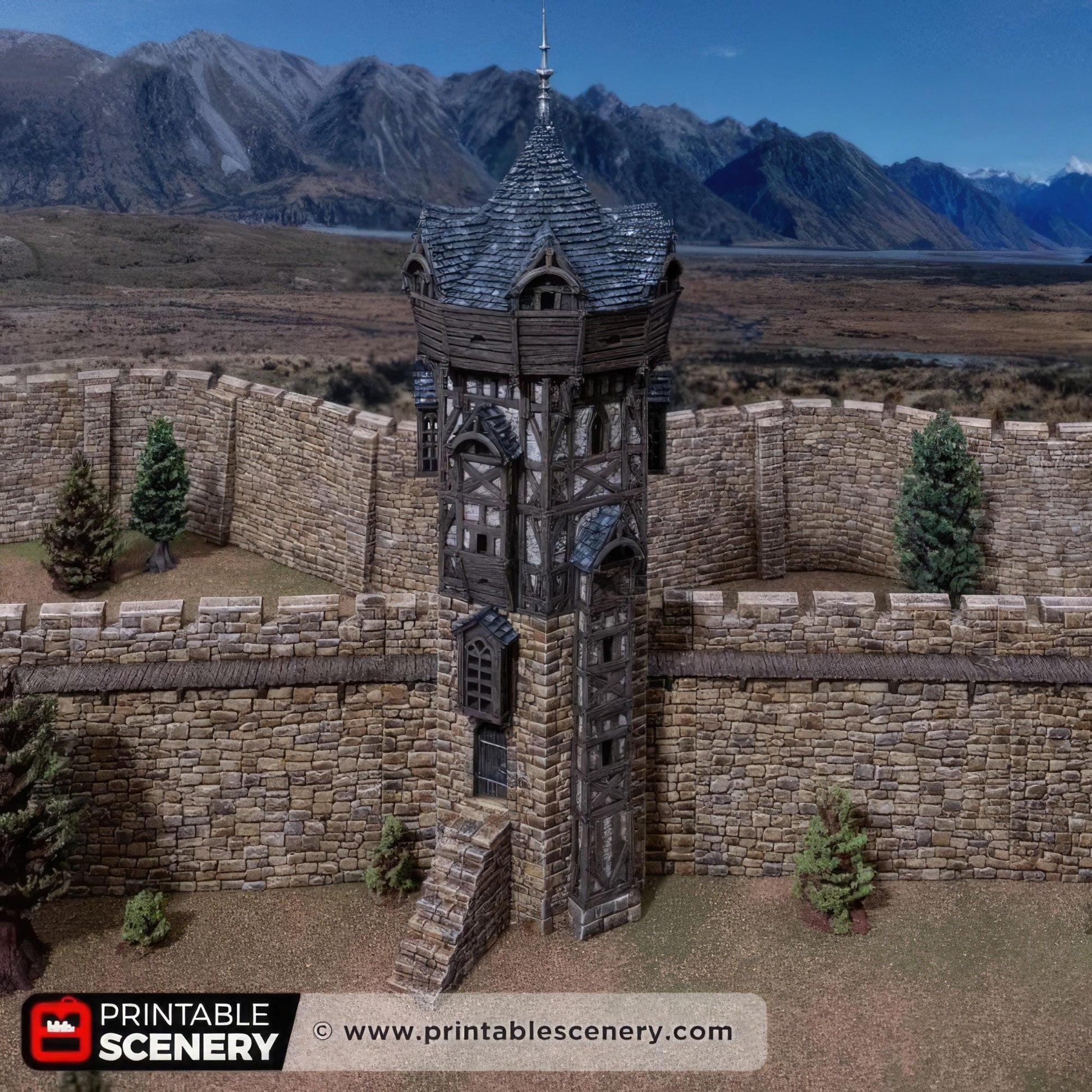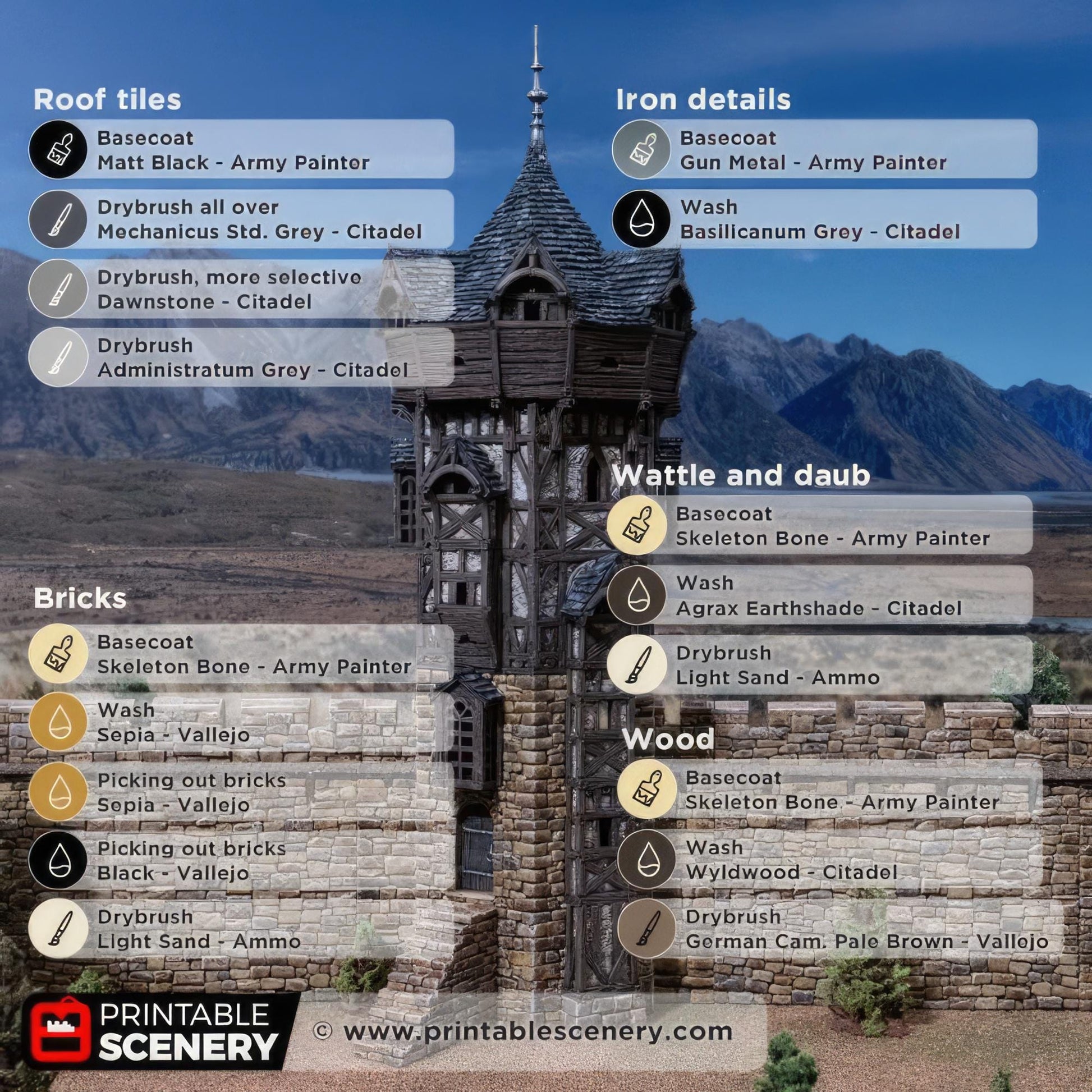 The HEX Castle Wattle and Daub Tower is a tall, fully modular and stackable building designed for use alongside the HEX Castle Walls or as a standalone structure. Each level is separate for ease of play: a solid stone base, a stone middle level, wattle and daub middle levels, a top level, and a wood hoarding roof. This tower comes with stair and window options, wooden bay windows, functional doors, corbels, and buttresses for standalone play. Adaptors are also included to seamlessly attach the tower to the HEX Castle Walls, making it a versatile addition to your tabletop castle or settlement.