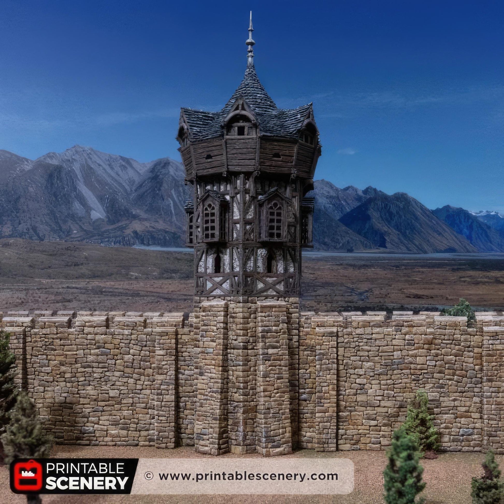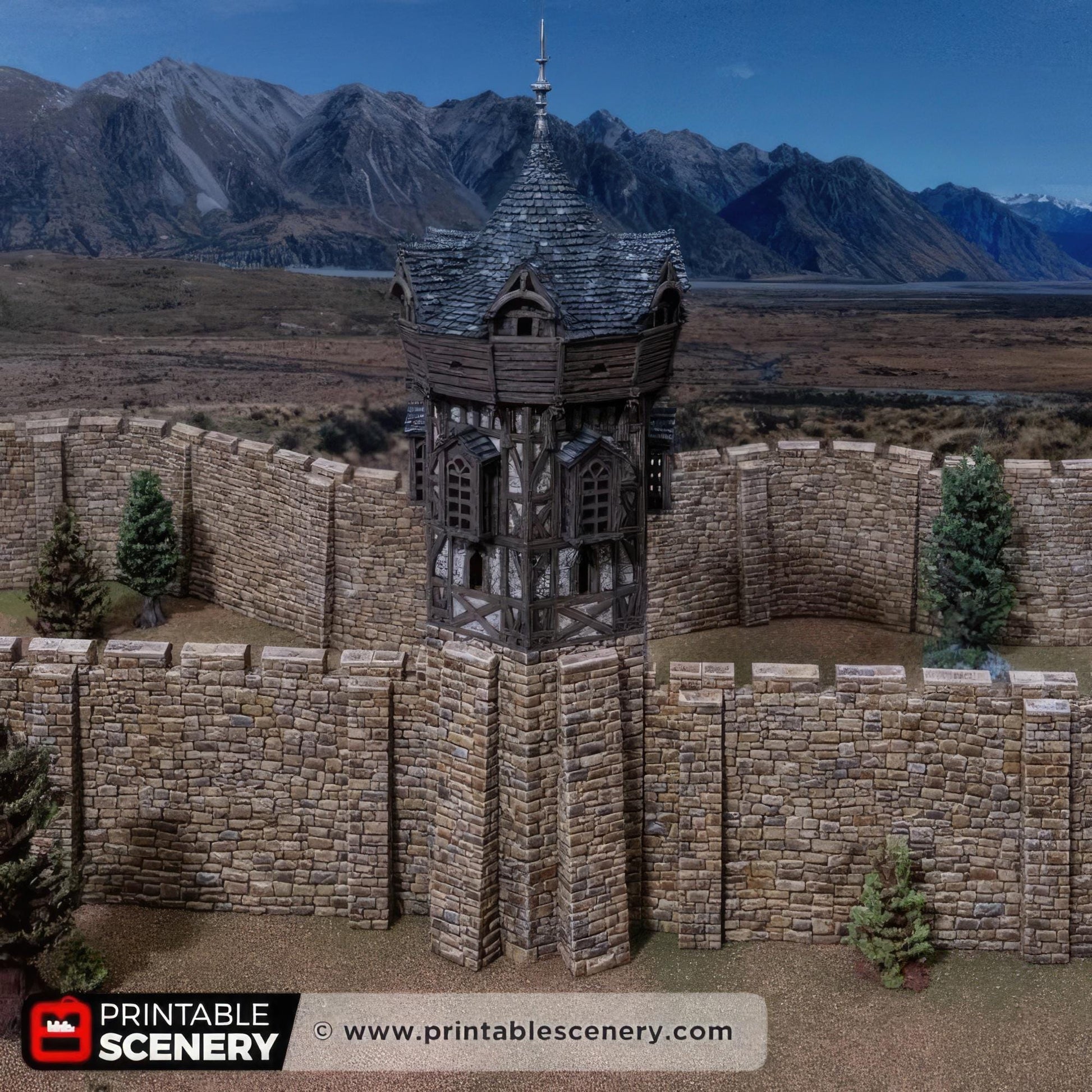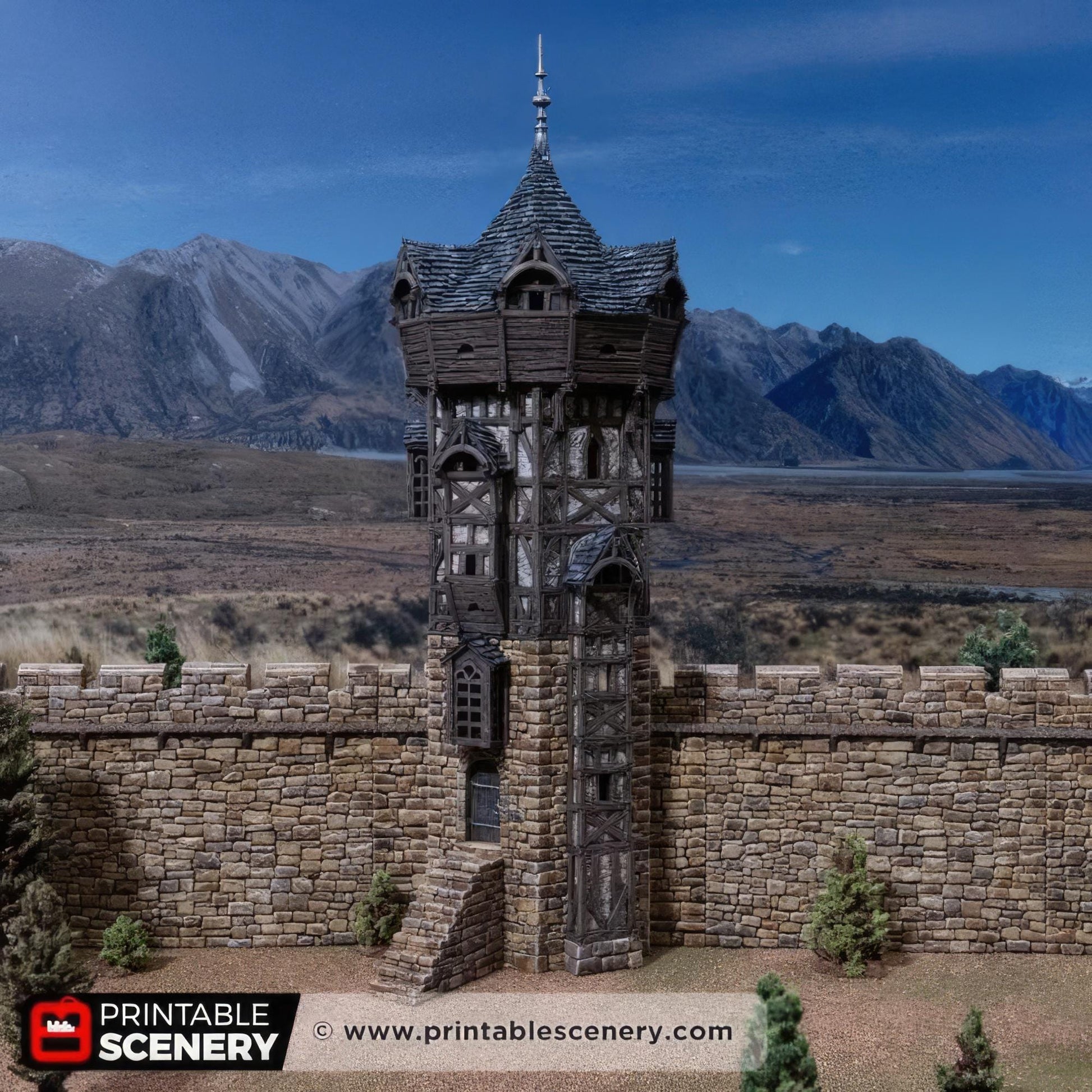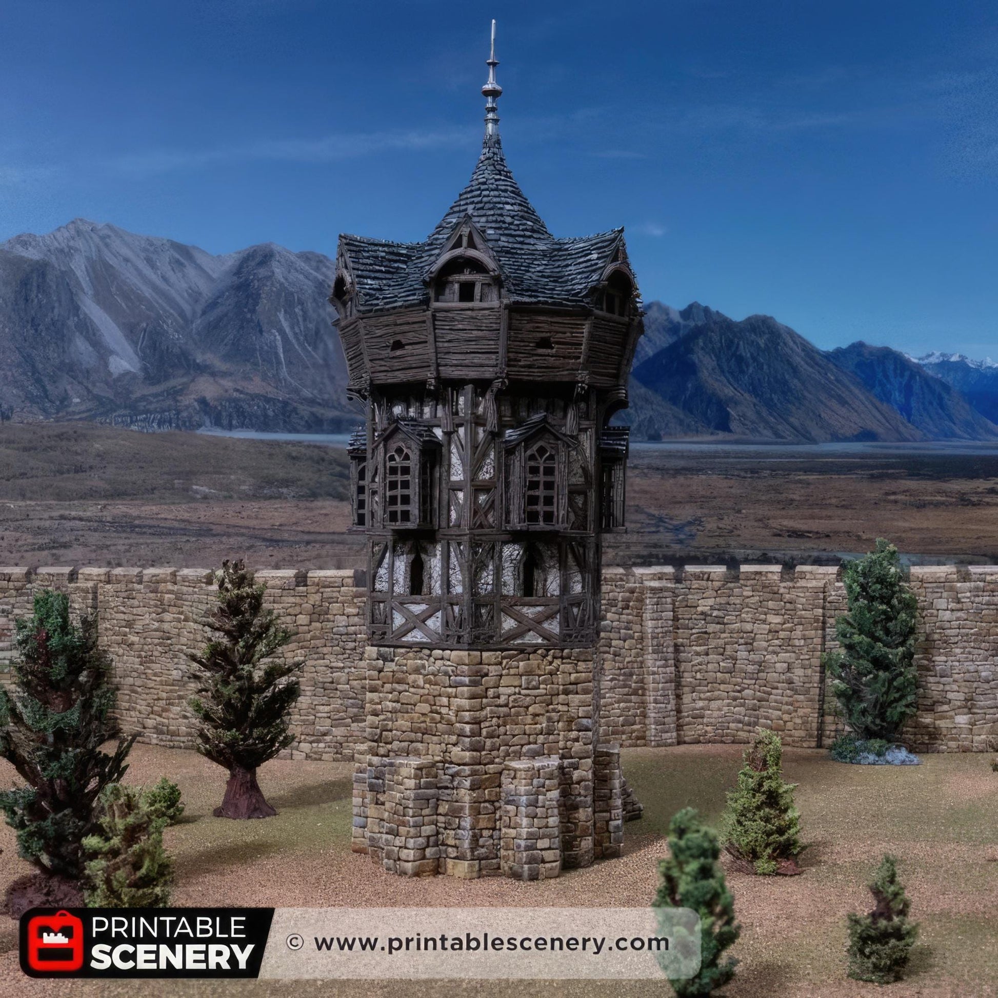 The HEX Castle Wattle and Daub Tower is a tall, fully modular and stackable building designed for use alongside the HEX Castle Walls or as a standalone structure. Each level is separate for ease of play: a solid stone base, a stone middle level, wattle and daub middle levels, a top level, and a wood hoarding roof. This tower comes with stair and window options, wooden bay windows, functional doors, corbels, and buttresses for standalone play. Adaptors are also included to seamlessly attach the tower to the HEX Castle Walls, making it a versatile addition to your tabletop castle or settlement.