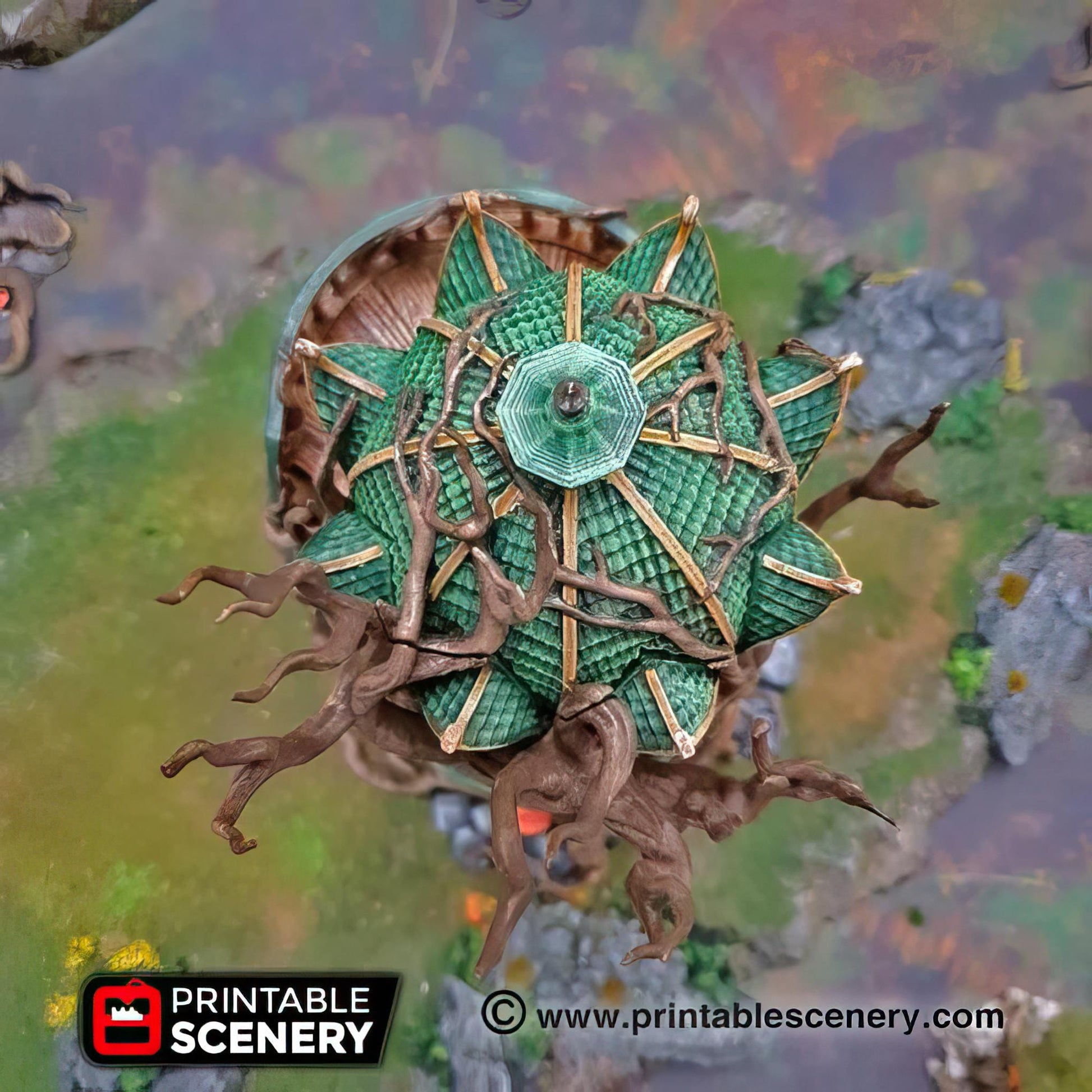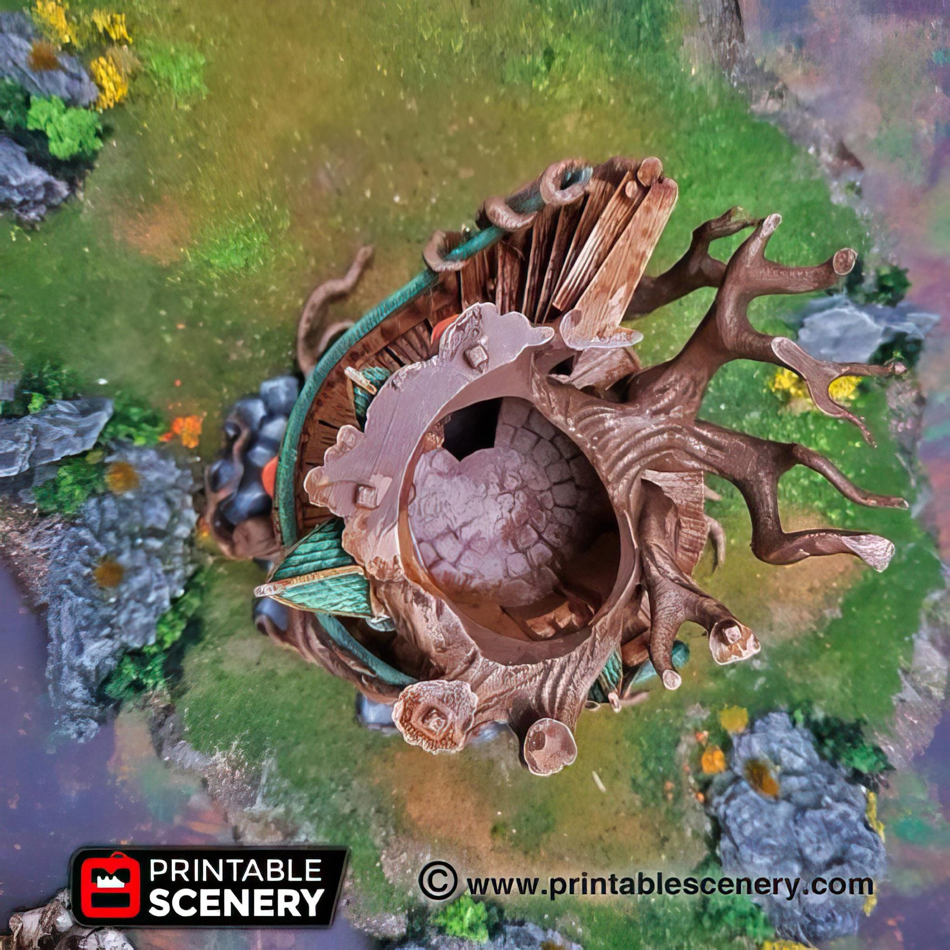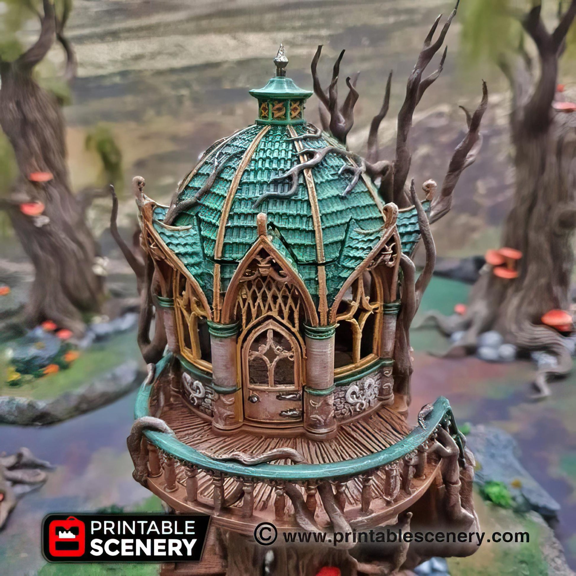 The Gloomwood Treehouse is a beautifully designed fantasy structure for tabletop and role-playing games. Featuring hinged doors, removable roofs, and multiple levels, this enchanting treehouse includes a winding staircase that leads to a cosy cottage nestled among the branches. Its sloping green roof and intricately carved windows blend seamlessly with the surrounding foliage, making it a hidden gem in any woodland setting.