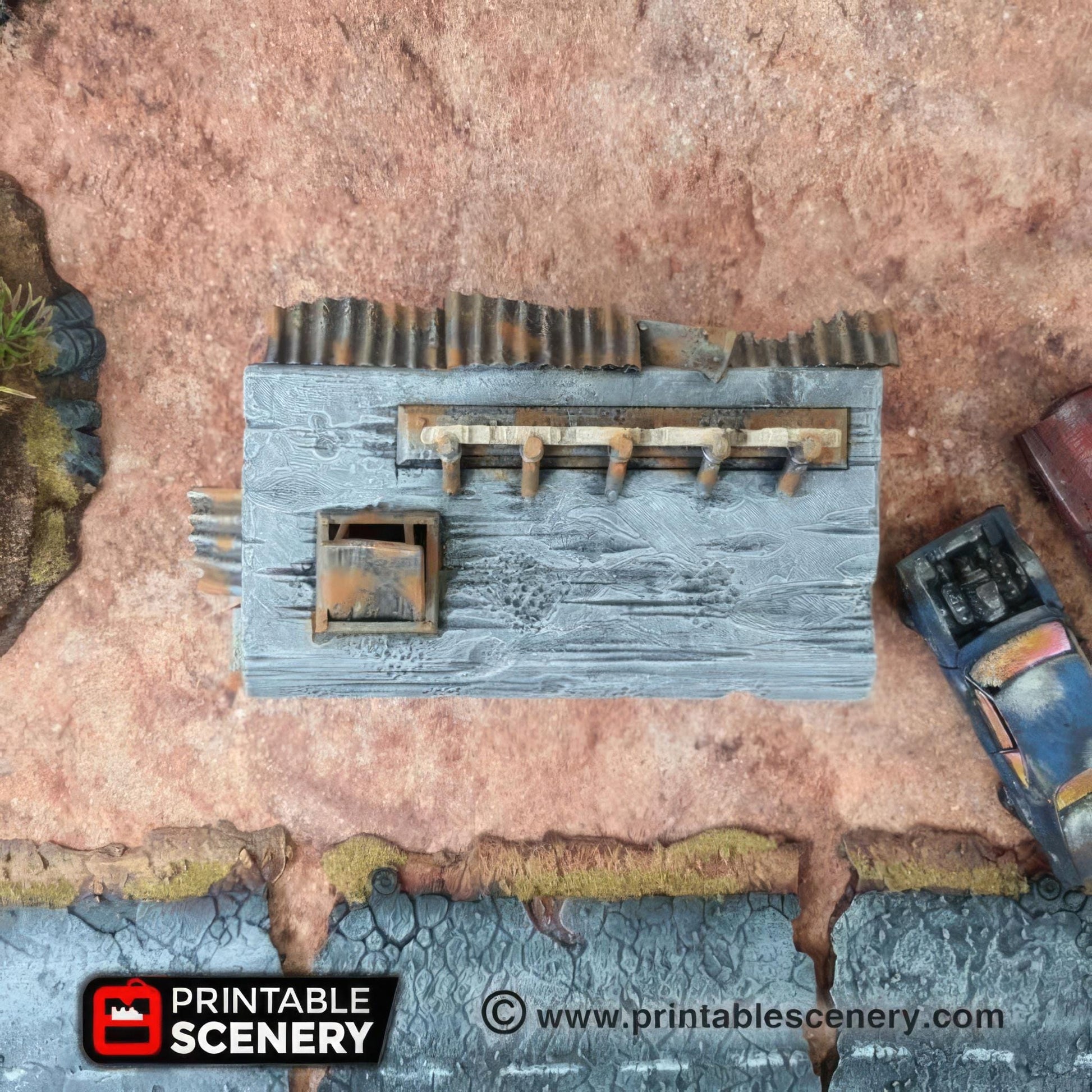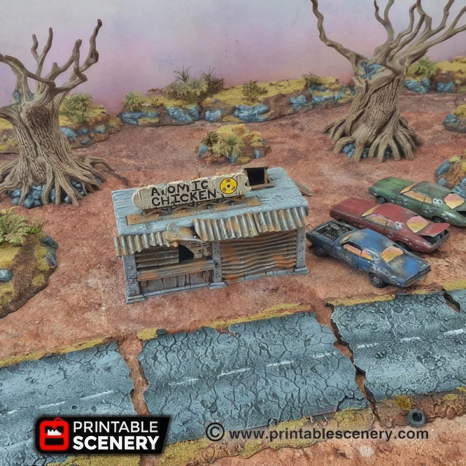 The Junkfood Franchise is a versatile, multi-story building designed for use in post-apocalyptic or sci-fi tabletop and role-playing games. Featuring hinged doors and removable roofs, it allows for fully playable interiors, making it an excellent setting for urban skirmishes, scavenger hunts, or faction hideouts in a crumbling world.