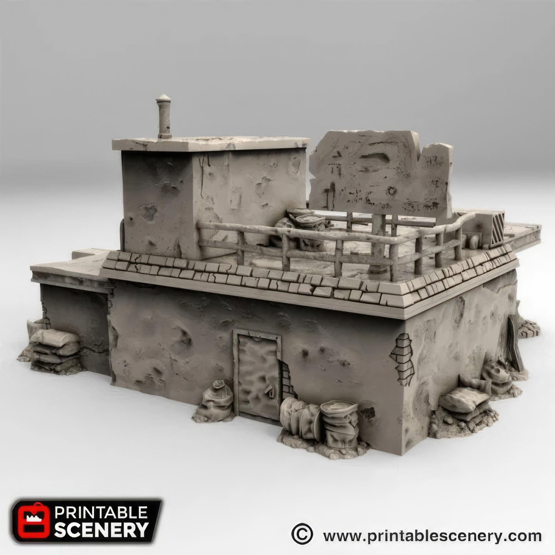 The Derelict Gas Station is a large, fully playable building set, perfect for post-apocalyptic wargames, racing games, and role-playing adventures. It features a detailed interior, along with separate counter, till, vending machine, rubbish, and bin to customize your station. This versatile set adds depth and realism to your tabletop battlefield.