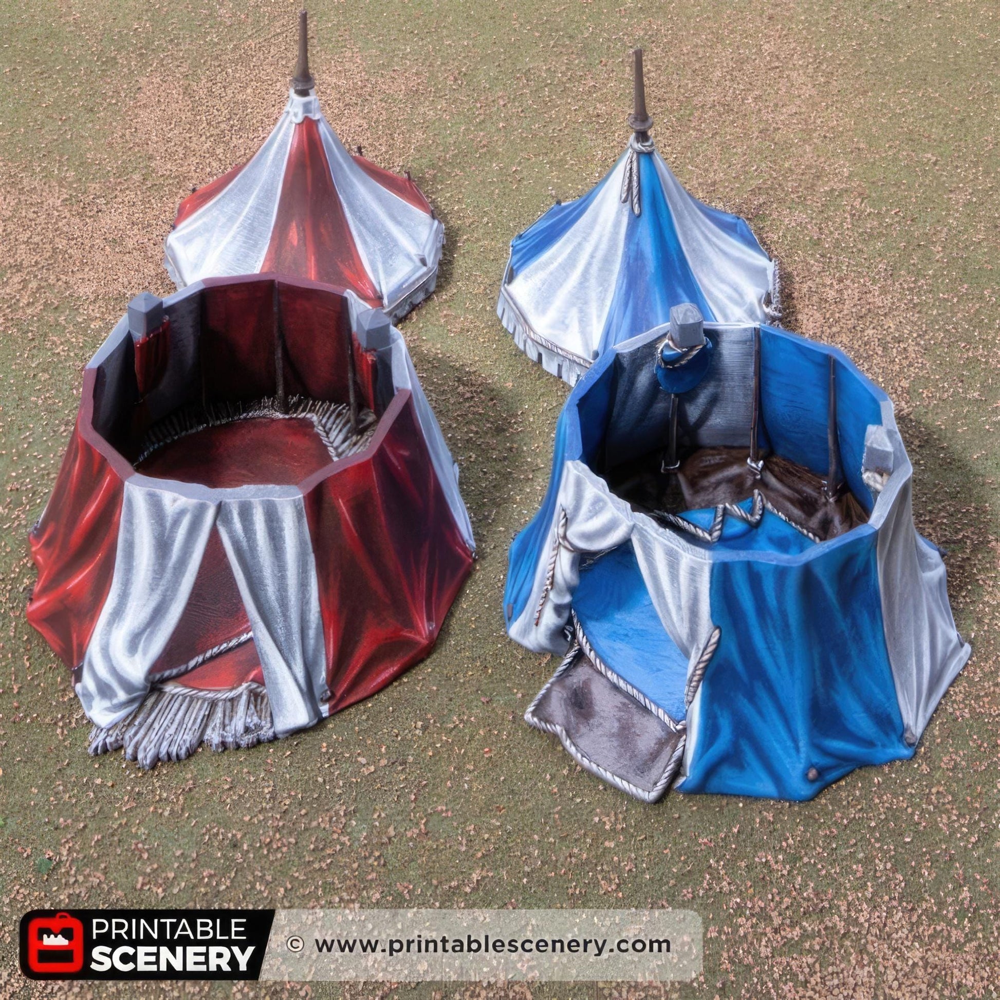 The Jousting Arena set brings the thrill of the tourney field to your tabletop, where knights duel for the King’s favour and the Princess’s heart. This set includes two unique tents, a stand, flags, and two fences. The decorative flags and shields are interchangeable, allowing you to customize the look of your tourney grounds for endless variety. Perfect for fantasy, medieval, or historical settings. Minis not included.