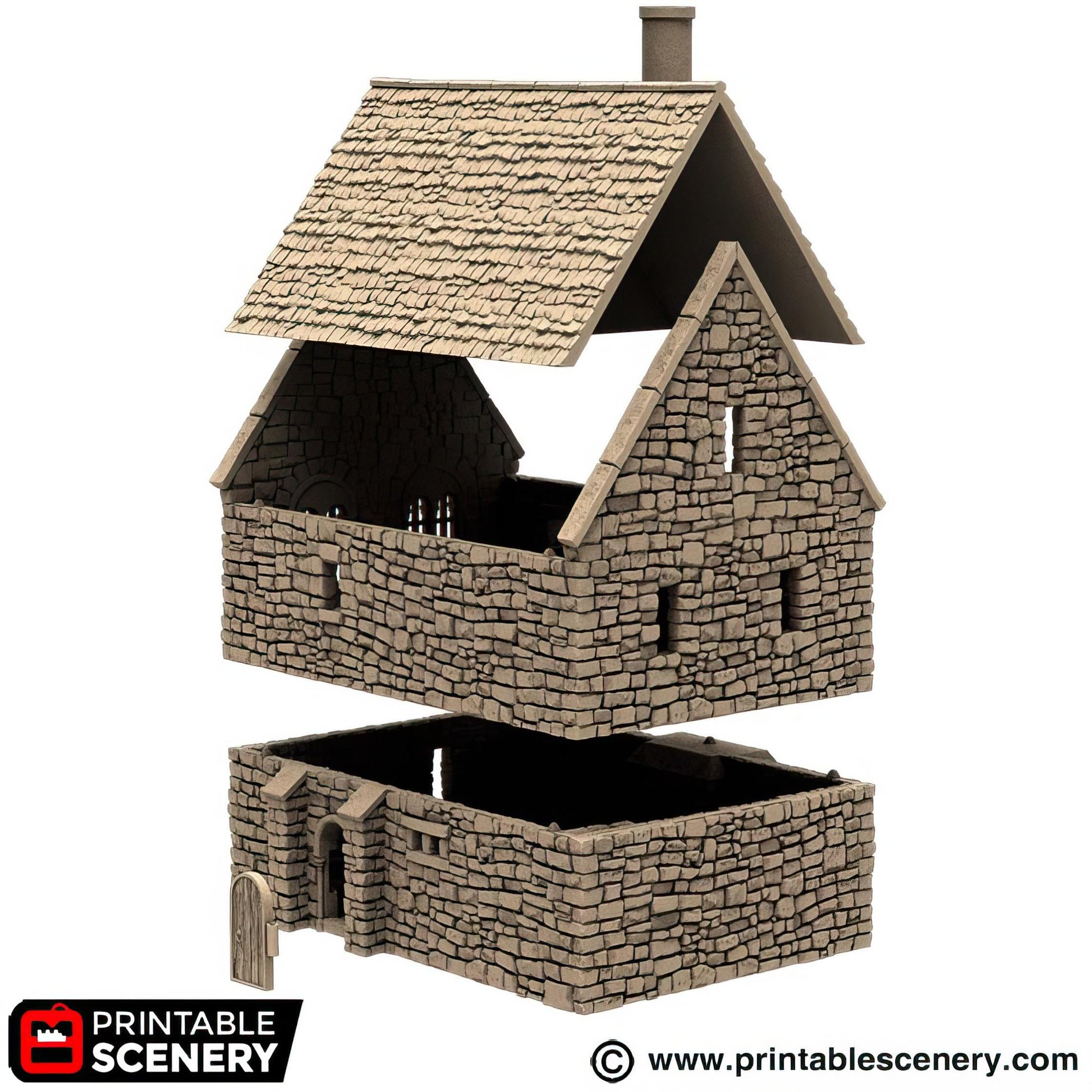 This two-story stone house combines medieval charm with functionality, featuring a removable roof and a fully detailed interior for immersive gameplay. Inside, stairs lead to the second floor, complete with a cozy fireplace and chimney. An optional ground floor with an extra doorway allows you to connect the Manor seamlessly to the Norman Stone Keep, creating a cohesive estate setup. Perfect for RPGs and wargames, this house adds depth and character to any tabletop environment.