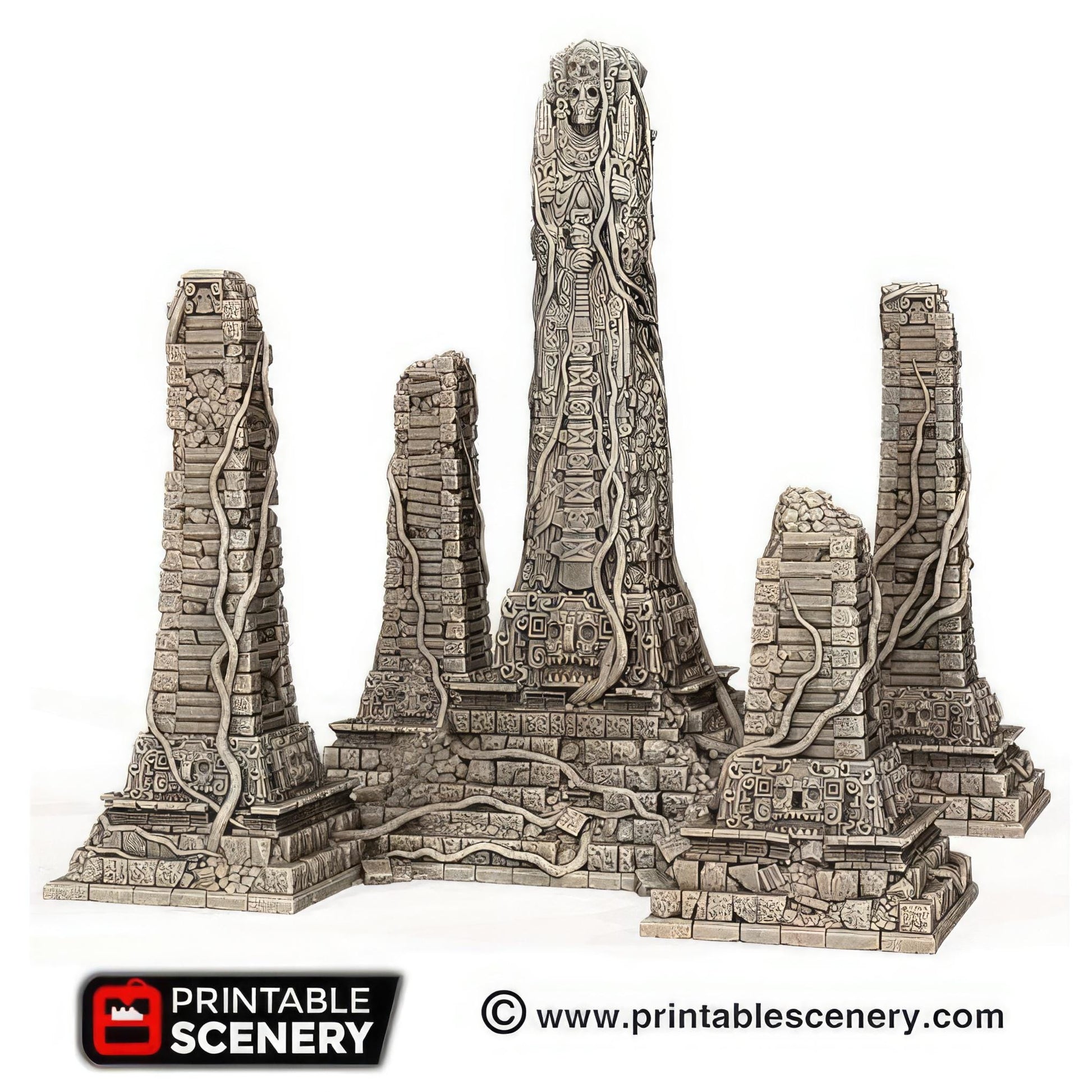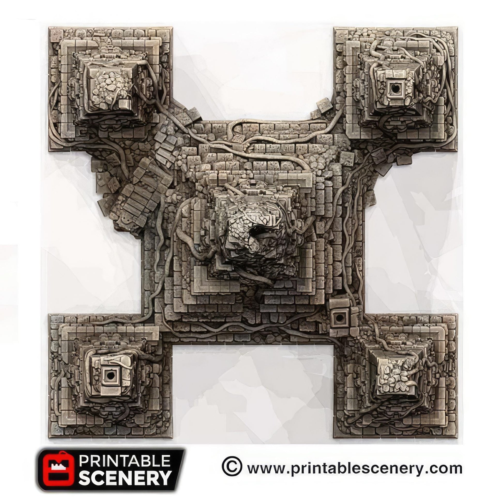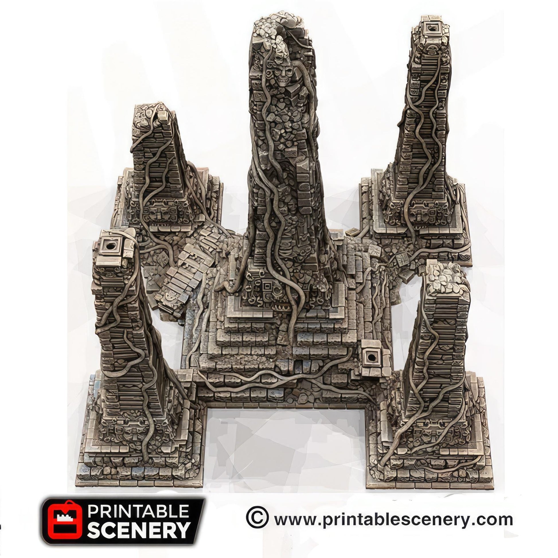 The Ruined Mortis Simulacrum is a weathered scatter terrain piece, perfect for adding a sense of decay and mystery to fantasy or sci-fi tabletop and role-playing games. Its crumbling structure creates an atmospheric centrepiece, enhancing the storytelling and strategic elements of your gaming table.