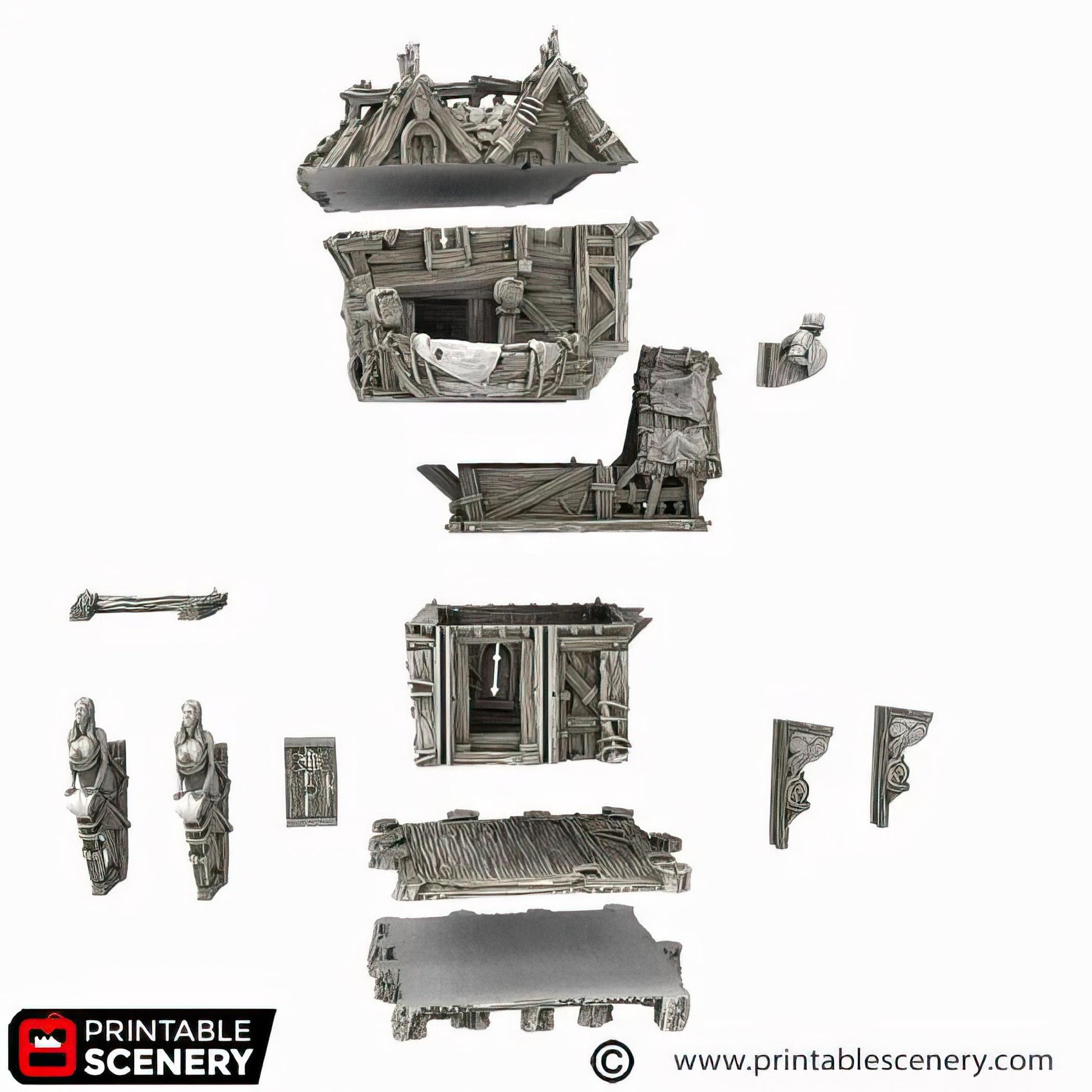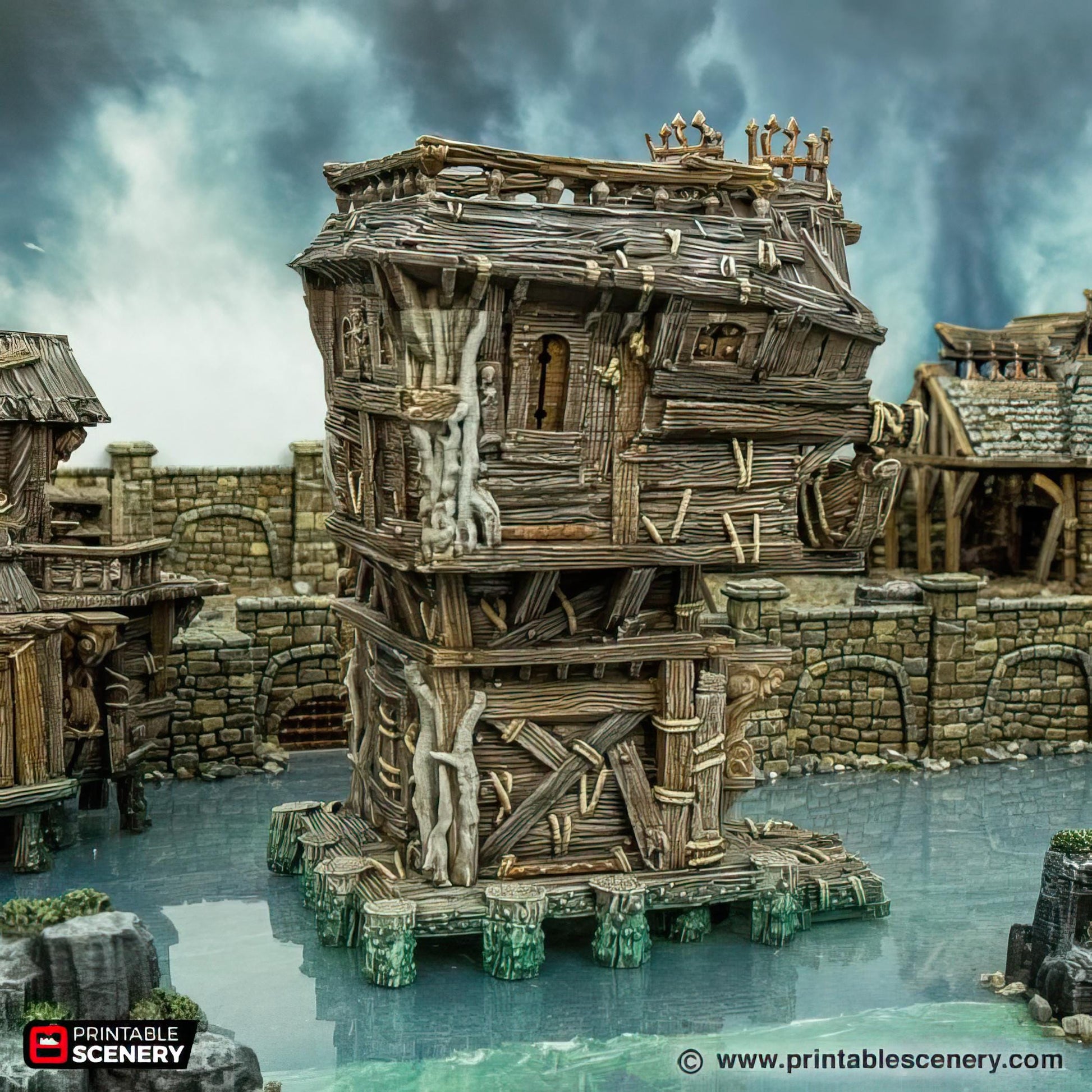 The Boatswain Bunkhouse is a unique, three-story building crafted from salvaged ship scraps, perfect for adding maritime charm to your tabletop adventures! Featuring functioning doors, removable corbel slots, and a detailed interior, this versatile structure brings depth to any scene. The bottom layer can even function as a standalone jetty, making it ideal for dockside encounters or seafaring campaigns. Whether used as a bustling harbour hub or a secluded hideout, the Boatswain Bunkhouse adds rich narrative potential to your RPGs and wargames.