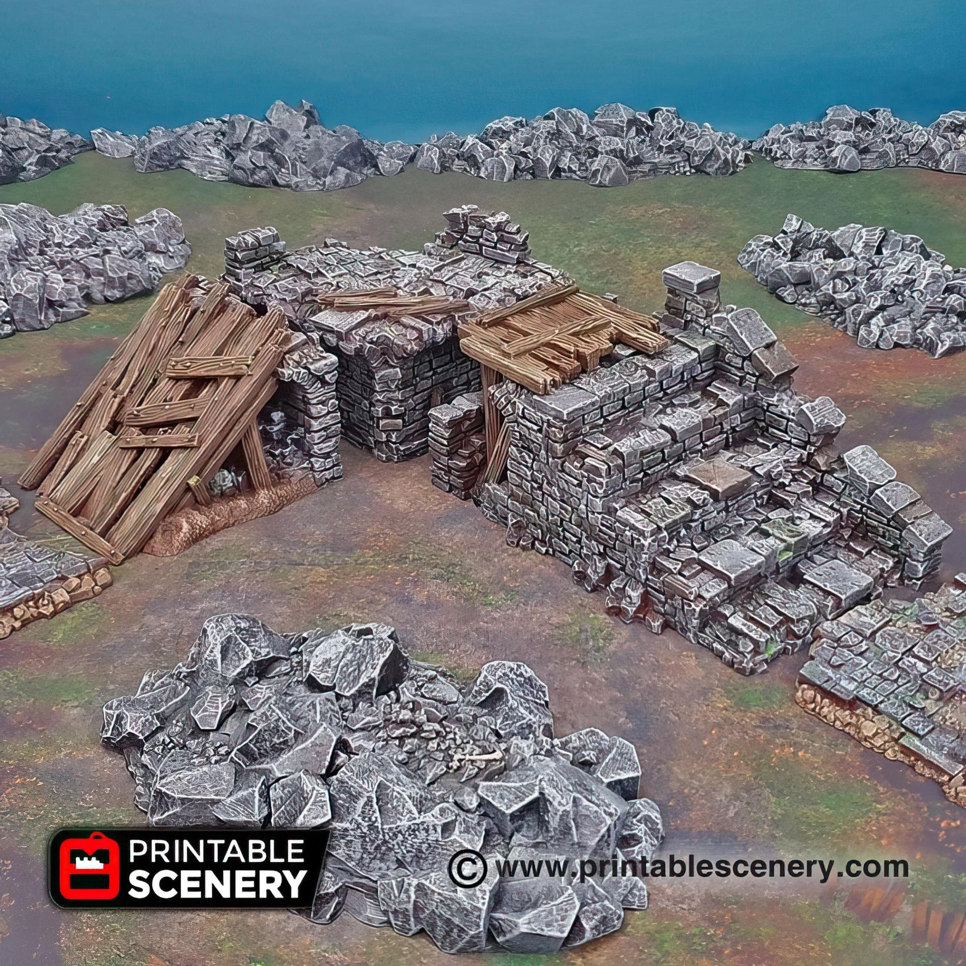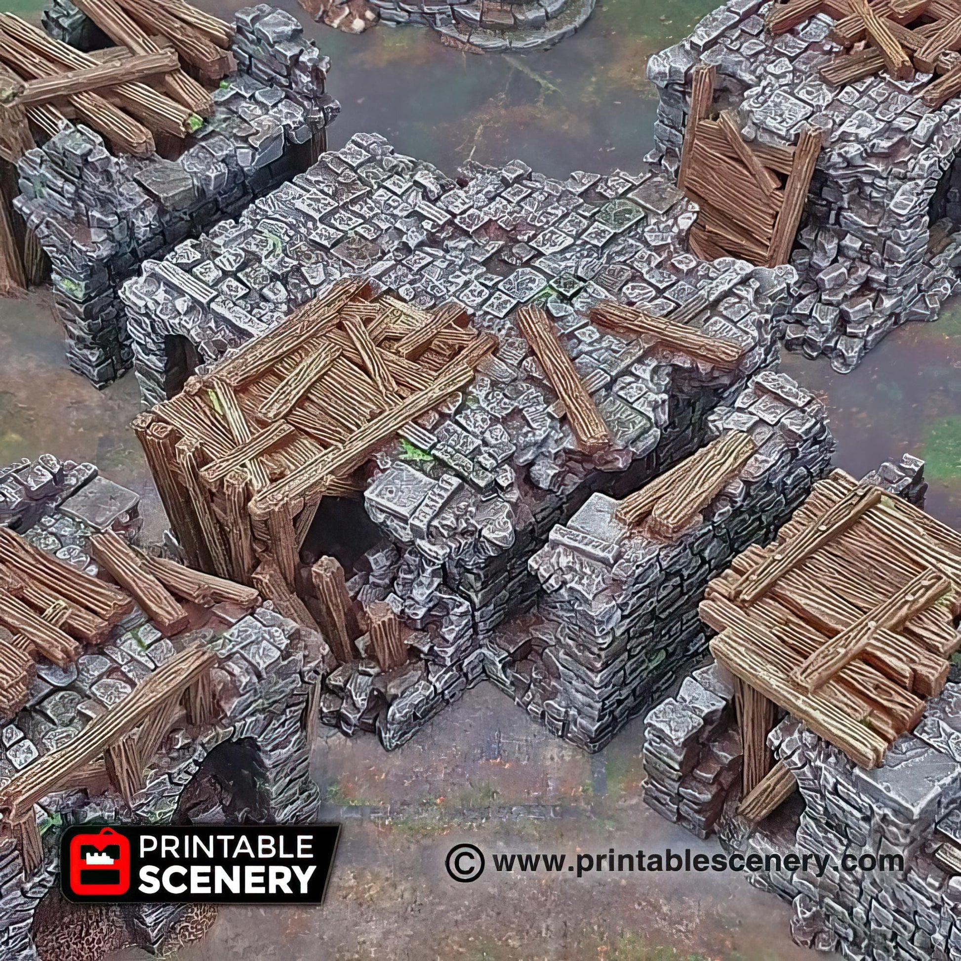 The Ruined Bridge Spans are a set of eight wood and stone structures crafted for raised walkways in wargames and role-playing adventures. Featuring removable scaffolding, each piece can be customized to suit your tabletop setup, adding depth and flexibility to your terrain.
