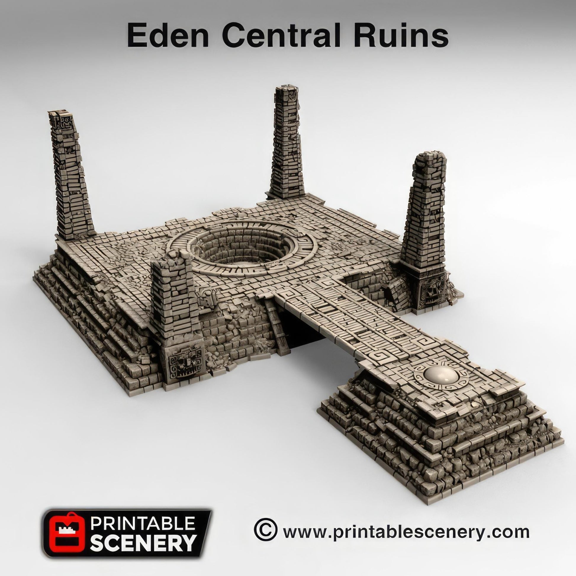 The Eden Central Ruins is a versatile scatter terrain piece designed for use in both sci-fi and fantasy tabletop skirmish and role-playing games. Serving as a striking centrepiece for your gaming table, it also functions as a large blocking piece of terrain with ample playable space on its elevated platform.
