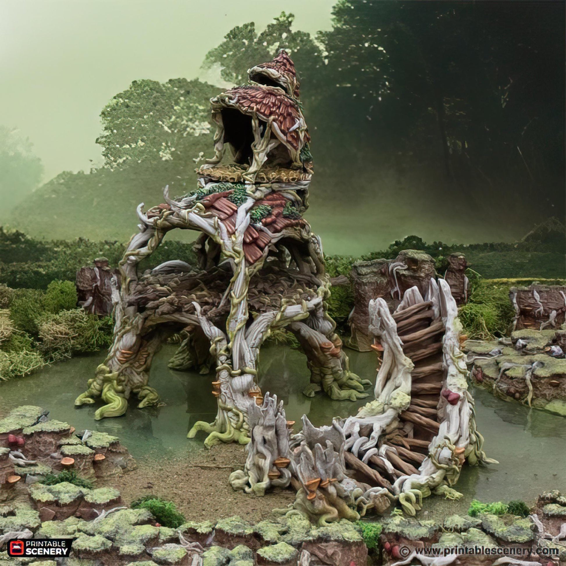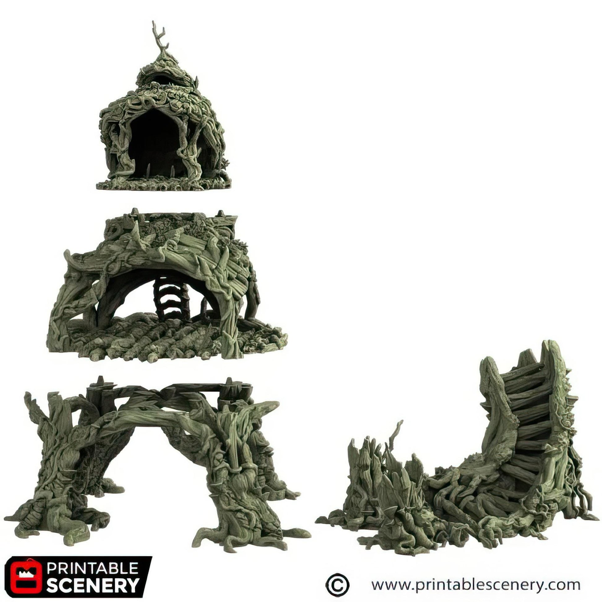 The Gloamwood Fort is a two-story structure crafted from intertwining trees, enhanced with wooden planks and tiled elements. This enchanting piece features the Gloamwood Stairs, seamlessly providing access to the first floor, making it a striking addition to any fantasy tabletop game.