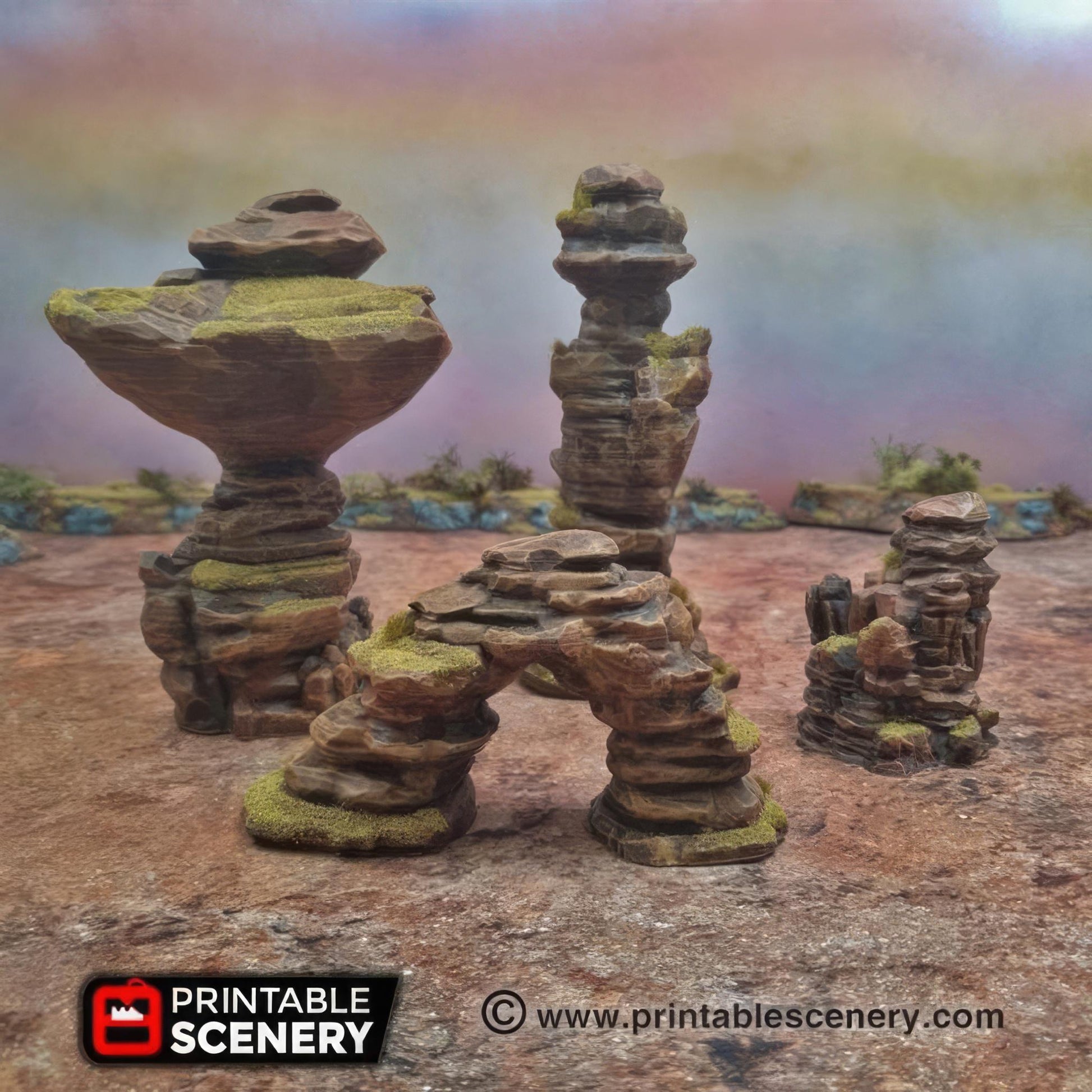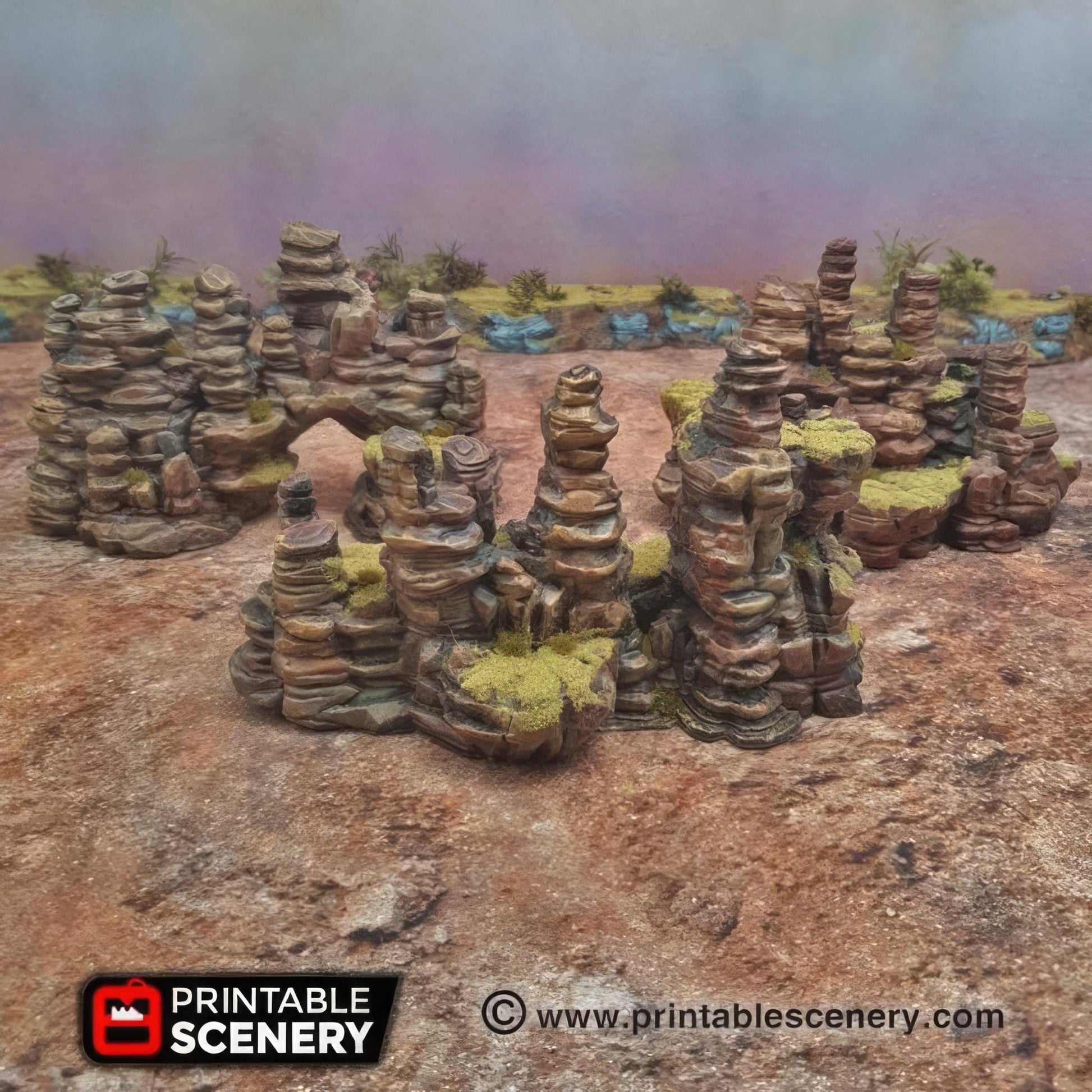 The Canyon Rocks Set includes 10 rock formations, featuring 3 ridge-lines, 3 plateaus, 3 rock towers, and a bridging piece. Designed with multi-level terrain and flat surfaces for miniature placement, this versatile set fits seamlessly into sci-fi, fantasy, or historical tabletop wargaming environments, adding depth and strategic elevation to your battlefield.