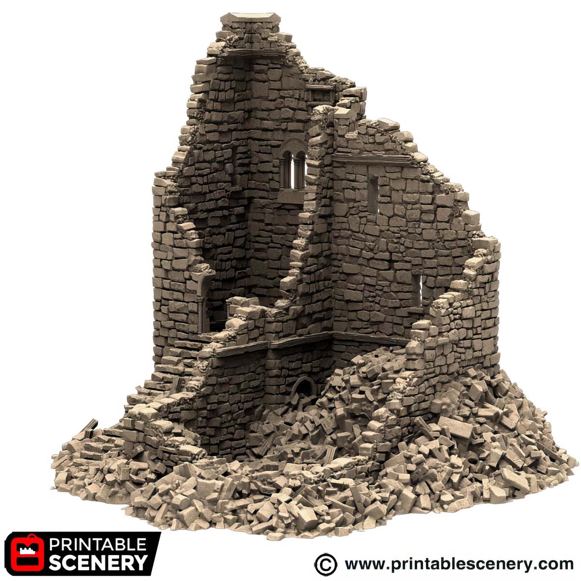 The Ruined Norman Stone Fort brings a sense of ancient destruction to your tabletop with its multi-level, partially collapsed stonework design. Each layer lifts off, revealing detailed, rubble-strewn interiors with functioning doors and ladders, allowing for dynamic miniature placement. Available with or without rubble for customizable terrain, this fort is perfect for creating tactical scenarios and atmospheric battles in RPGs and wargames like Kings of War and A Song of Ice and Fire.