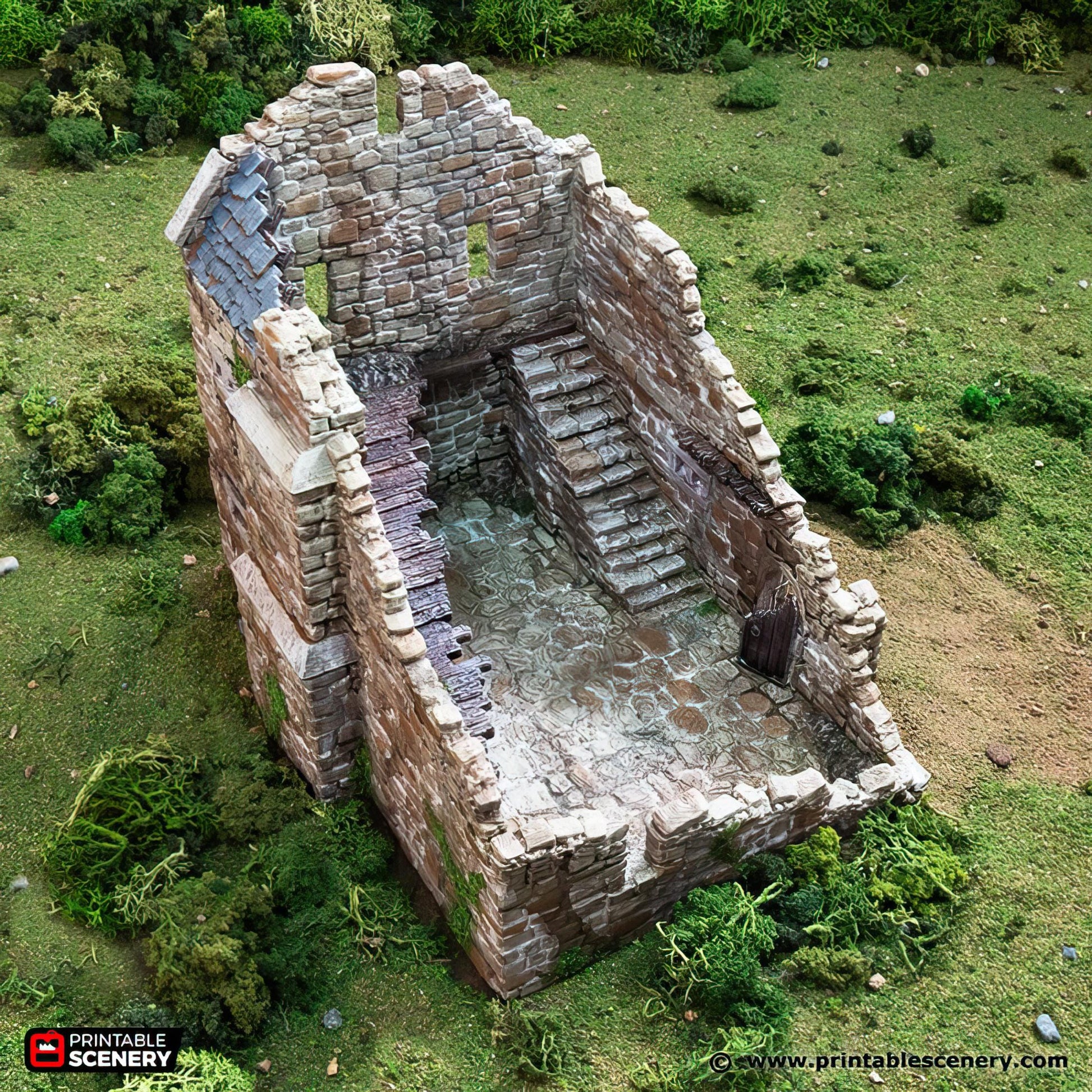 The Ruined Norman Stone Manor adds an atmospheric touch of decay to your tabletop, available with or without rubble on the ground level—perfect for depicting recent destruction or ancient, weathered ruins. The two-story structure offers easy access to the upper floor via stairs, with ample space for miniatures on the fragmented flooring. Designed for RPGs and wargames, this manor brings haunting realism and tactical options to your medieval settings.