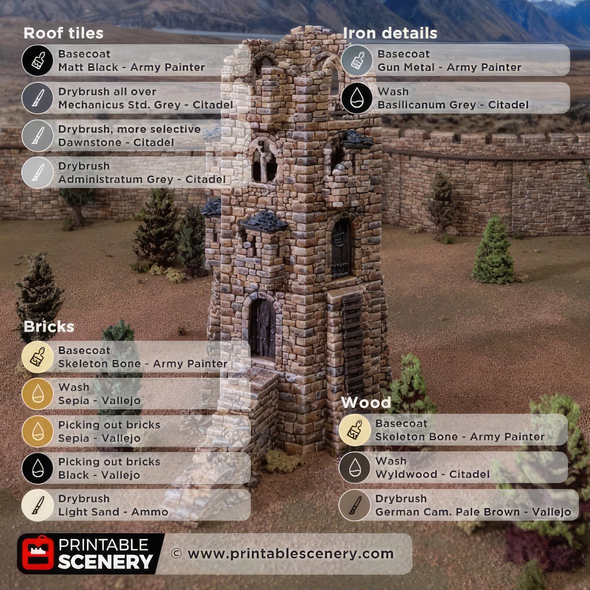 This multi-level model includes each floor separately—the base, the middle levels, and a shattered top level—perfect for staging encounters on every floor. It comes with ruined window options, functional broken doors, collapsed stairs, and fractured buttresses for when it isn’t connected to a wall.