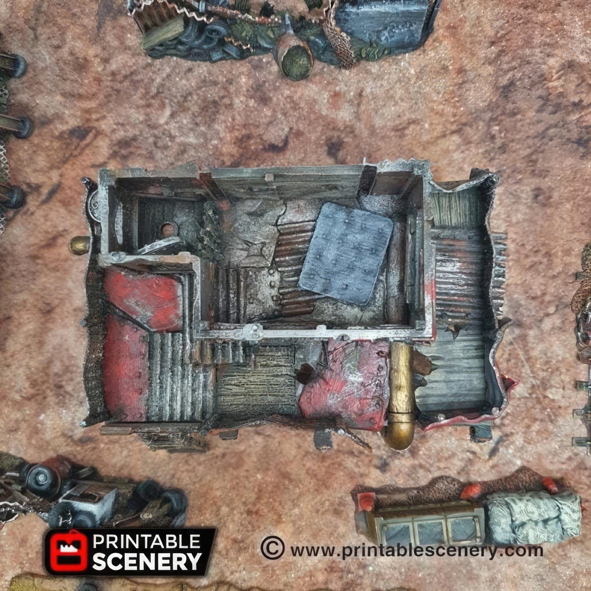 The Survivalist Shack is a multi-story building designed for post-apocalyptic or sci-fi tabletop and role-playing games. Featuring hinged doors and removable roofs, this rugged structure serves as the perfect hideout, scavenger outpost, or last refuge in a hostile world.