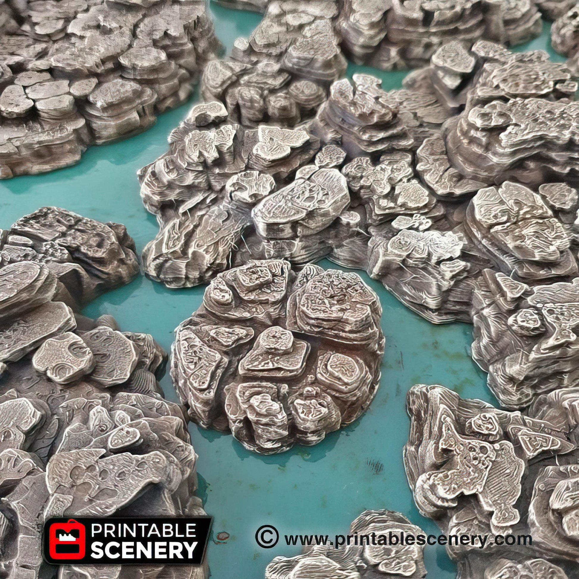 Enhance your tabletop gaming experience with this 7-piece scatter rock floor set! For great underground adventures and cave encounters. Durable and detailed, these rocks add depth and realism to any gaming scenario.