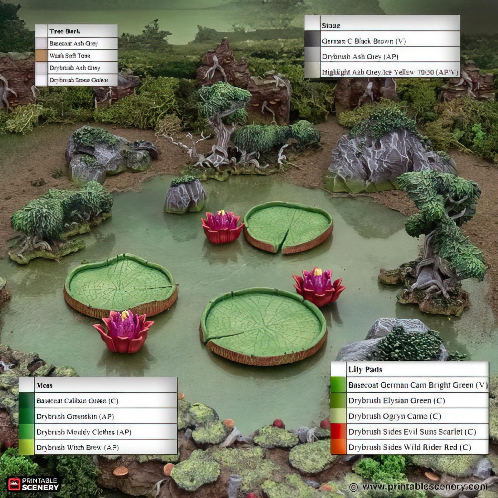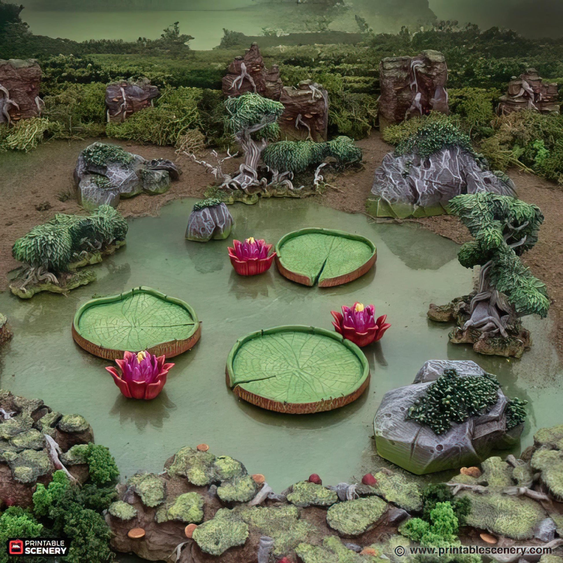 Transform your tabletop into a mysterious wetland with this 13-piece Swamp Scatter Set! Featuring detailed lily pads, vibrant flowers, rugged rocks, and gnarled trees, this set captures the eerie beauty of a swampy landscape. Perfect for RPGs, wargames, or dioramas, these pieces add depth and atmosphere to your gaming sessions, allowing for immersive encounters in treacherous marshes or hidden bogs. Bring your campaign to life with the rich, detailed elements of this swamp scatter set!