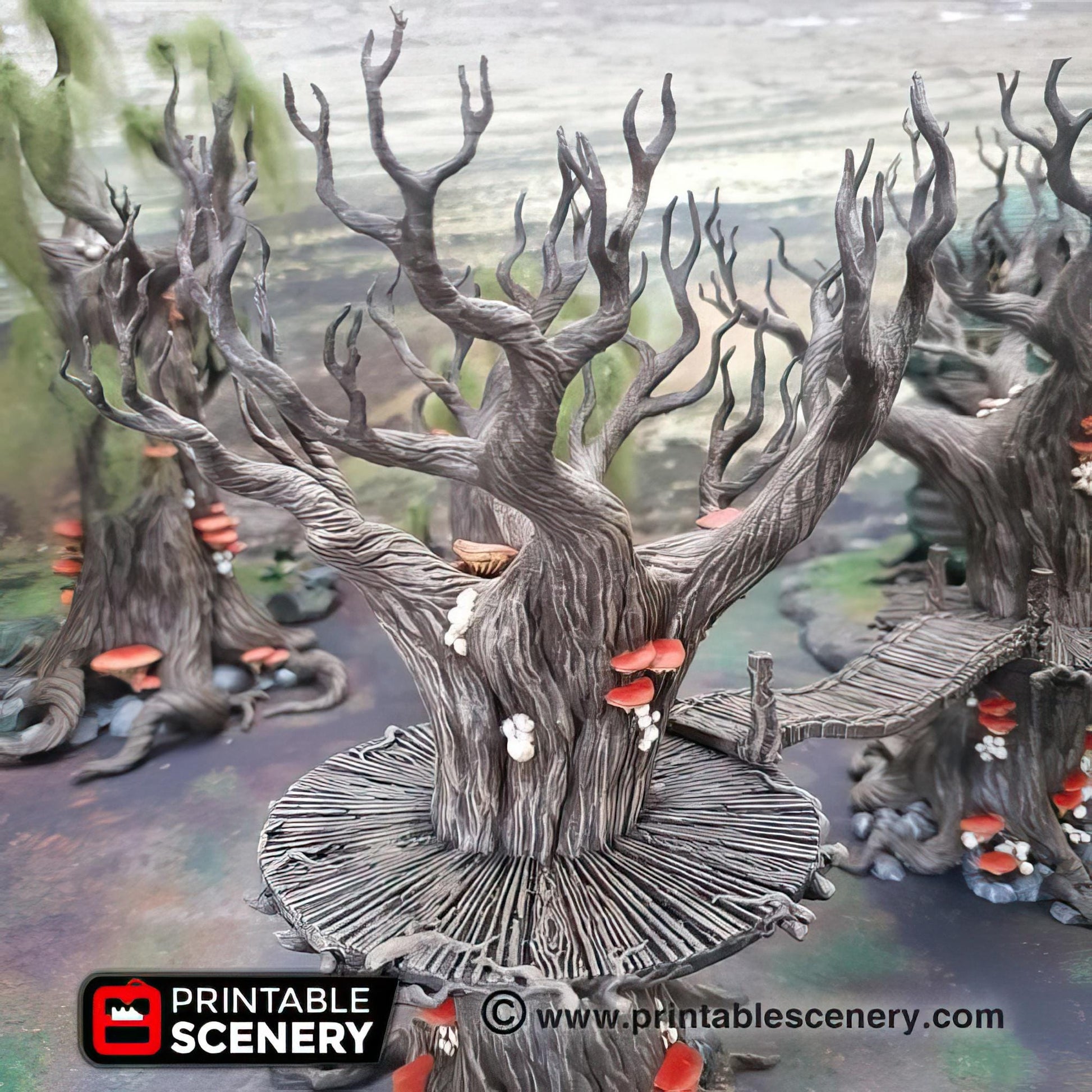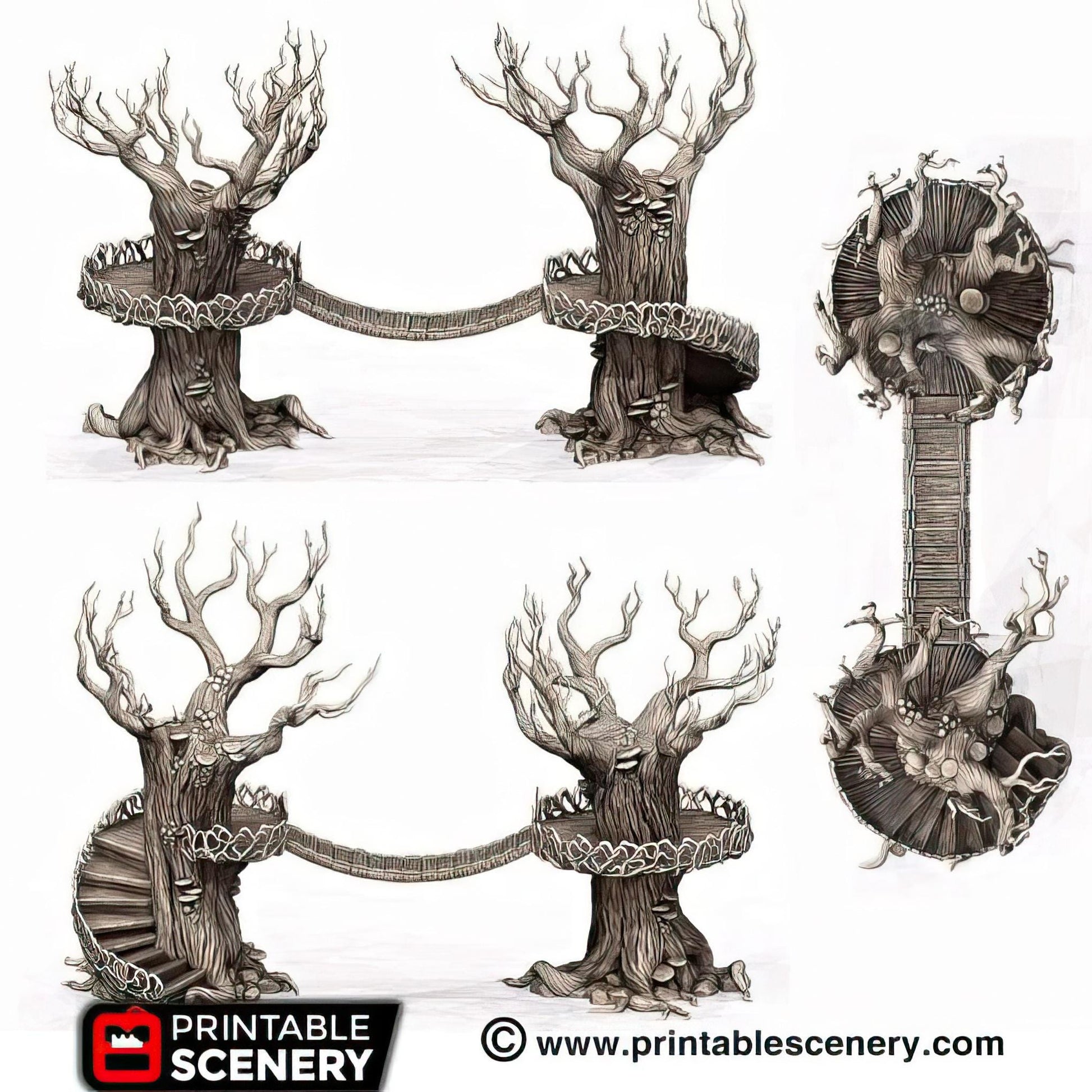 The Elven Walkway is an elegant multi-platform system built seamlessly into towering Gloomwood trees. Perfect for creating elevated pathways, it adds a touch of natural sophistication to fantasy tabletop and role-playing games.