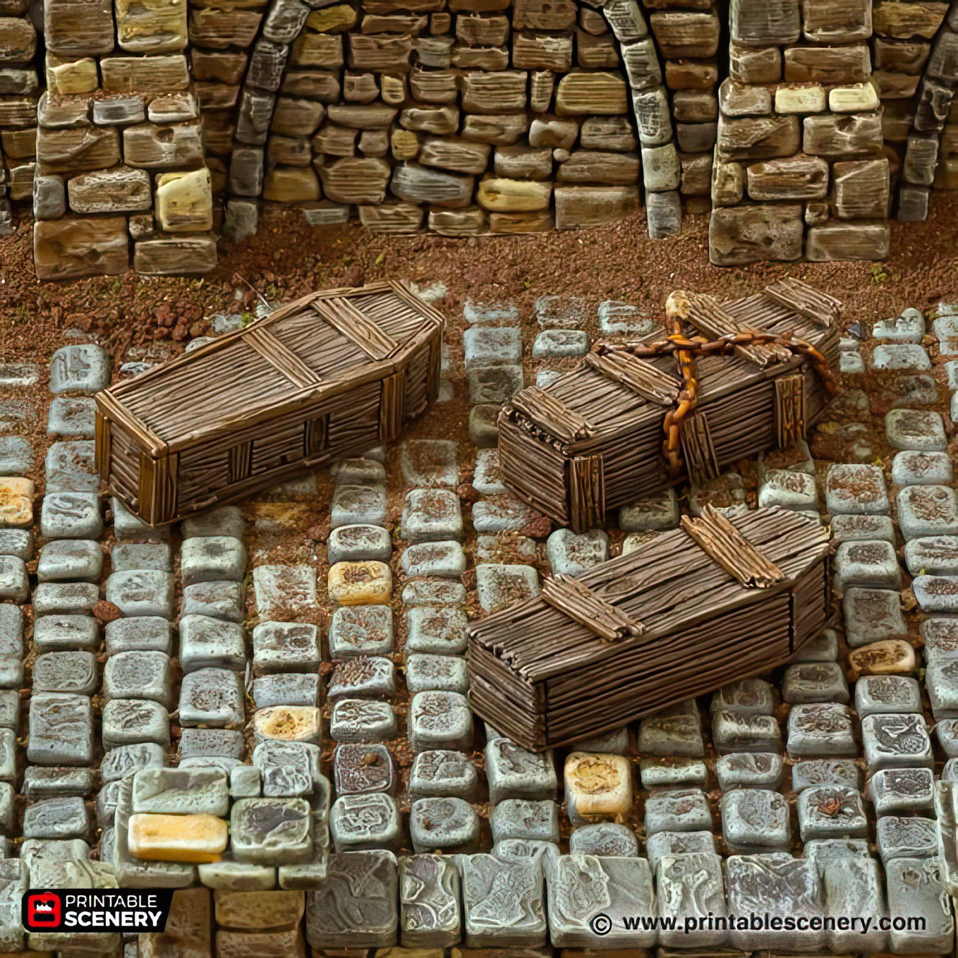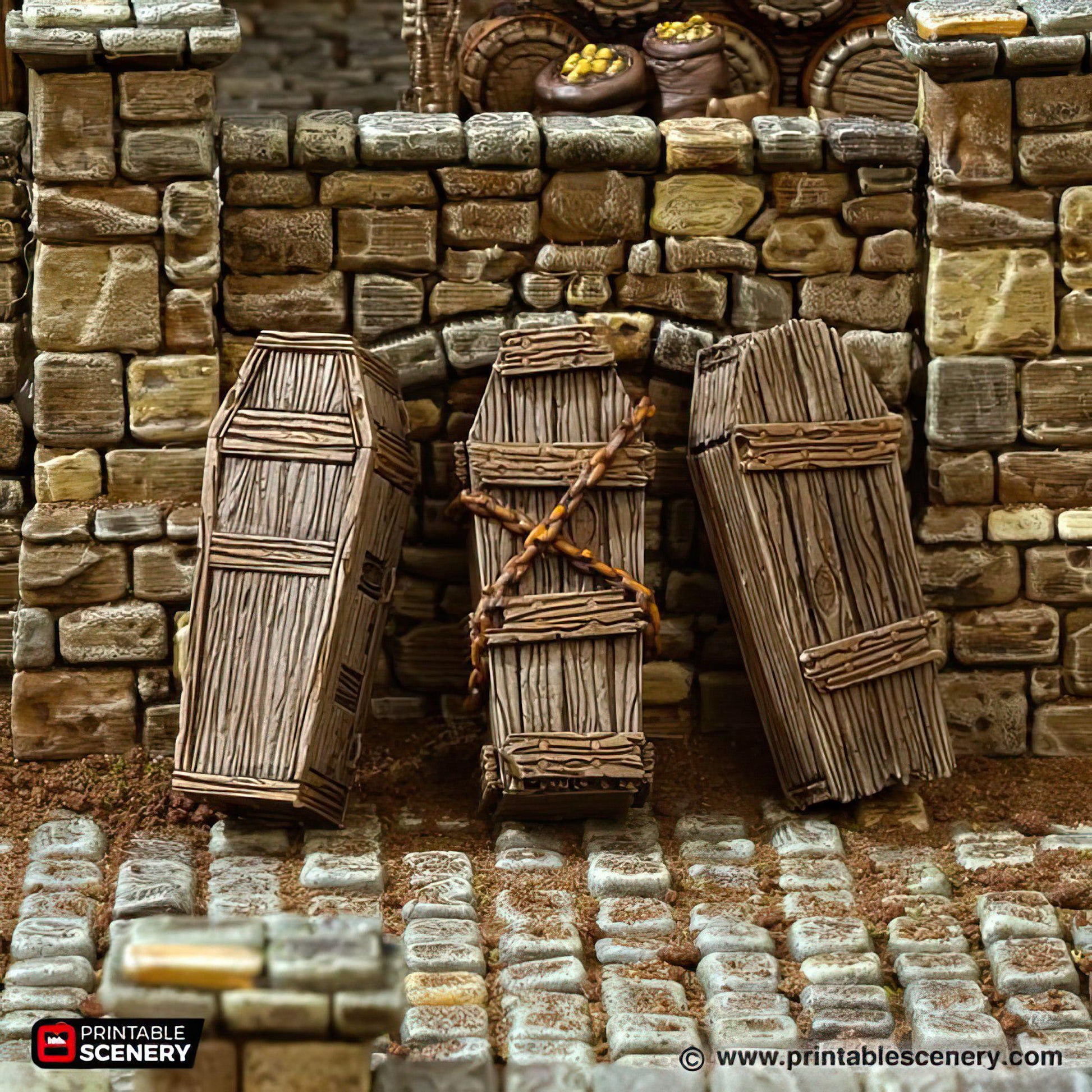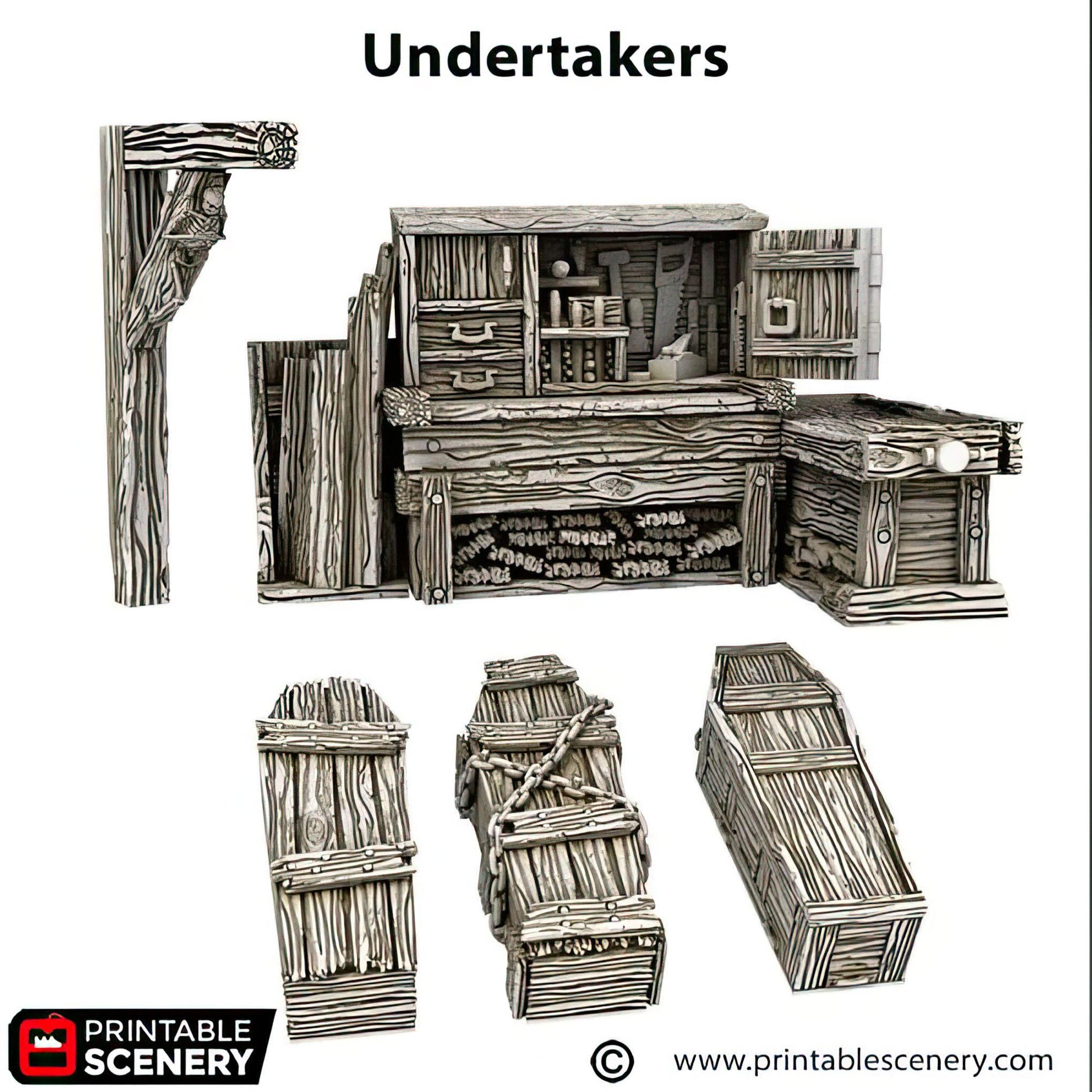 The Undertaker set brings a touch of eerie character and detail to your tabletop battlefields. It includes three distinct coffin designs, an undertaker’s bench and a skeleton signpost, perfect for creating atmospheric scenes or objectives in RPGs and skirmish wargames.
